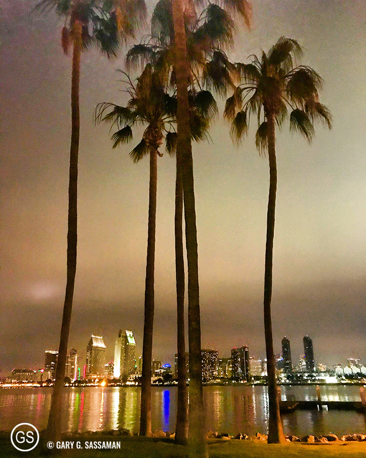 I don’t go out at night a lot these days, but here’s a shot from a recent walk home after a nighttime ferry ride. This is my neighborhood, facing the incredible San Diego skyline, and some nights—like this one—the atmospheric conditions and the lights of the city combine to make something really magical, like some kind of storybook kingdom.