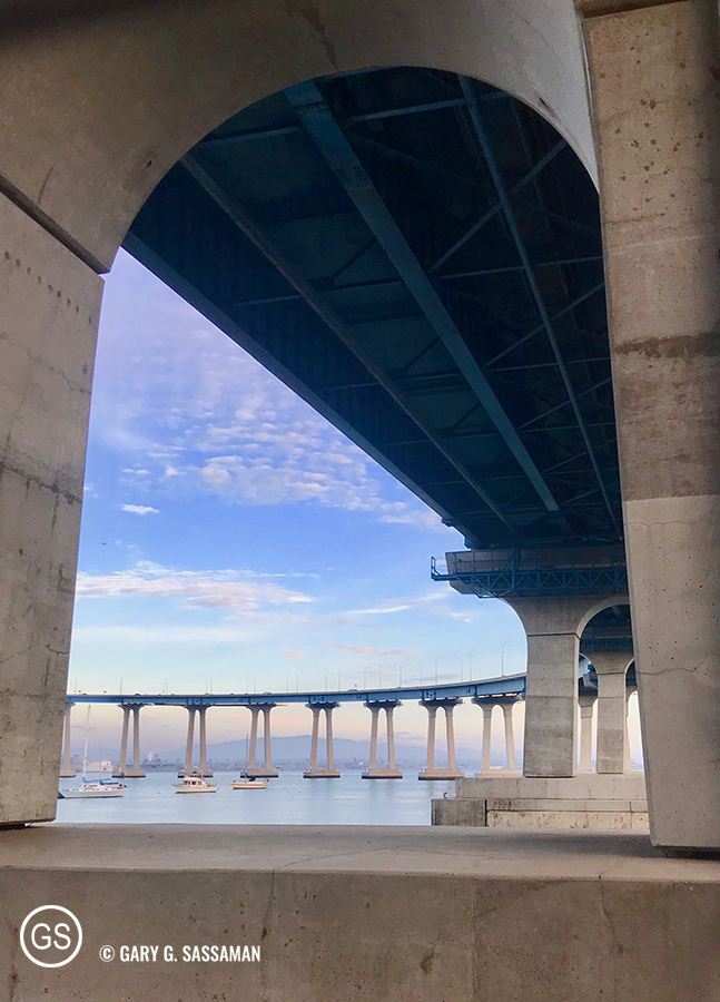 This is my preferred walk these days: Along the Coronado waterfront, under the amazing Coronado Bridge, whose gentle curving sweep takes my breath away no matter which direction I’m traveling in (to Coronado, from Coronado, or under the bridge, like above). From there I continue on the bike path past the golf course on to Glorietta Blvd., and up into the Village. I love the fact that I live in an area that calls its downtown area “The Village.”