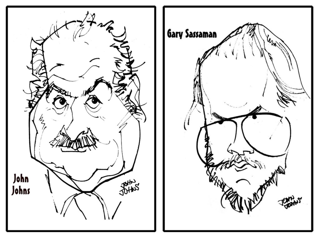 John Johns was a 1940 graduate of the Art Institute of Pittsburgh and the school’s president from 1970 to 1982. He was a bit of a Pittsburgh legend, regularly contributing covers to the Pittsburgh Press’s weekly TV Graphic magazine. In fact, he was a staff artist at the newspaper and he also made one contribution to MAD magazine in 1970 (all this info comes from artist/caricaturist Drew Friedman’s excellent blog post on Johns … click here to read it). He was also a huge friend to the Pittsburgh Comix Club and drew caricatures of all the current members present at Pittcon in 1979 … including the guests, like Len Wein, Marie Severin, and Jim Shooter. That’s a self-caricature of Johns up top, alongside a sullen-looking 24-year-old that he also drew. Johns had a system for caricature he taught to students, to help them earn extra money by appearing at parties and events. Sadly, I didn’t know that existed while I was at AIP.