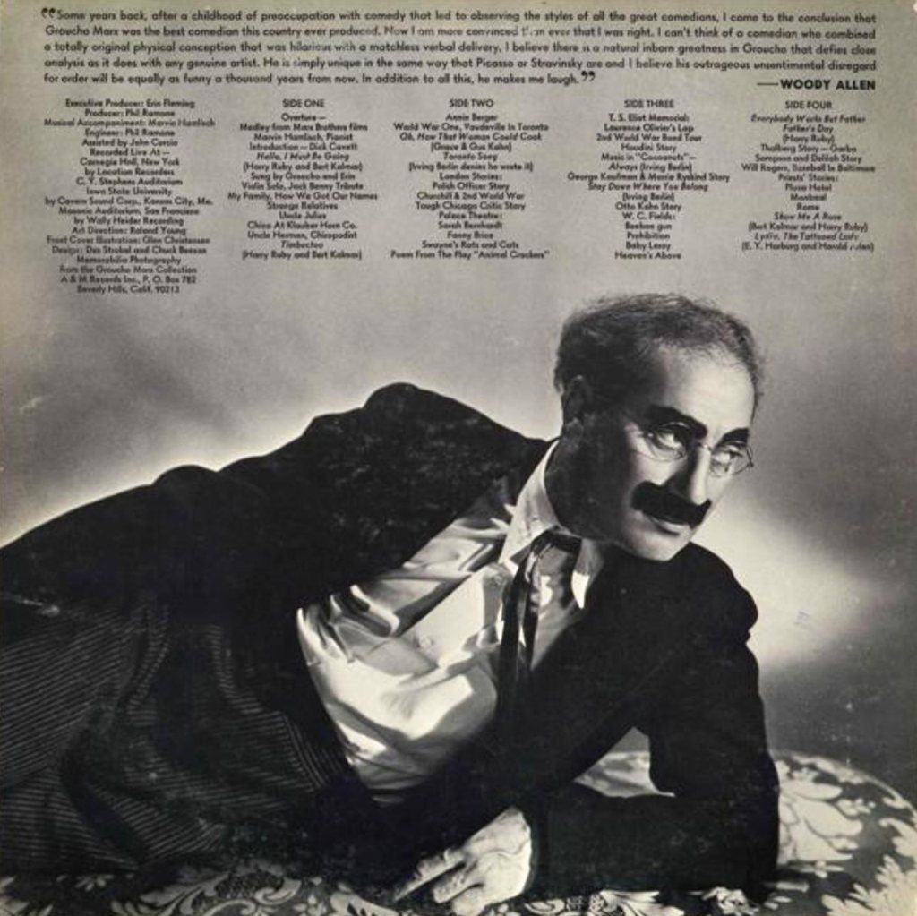 All of this caused a bit of a renaissance for Groucho, the only remaining brother. Chico and Harpo had both died in the early 1960s, and Zeppo had retired after Duck Soup to pursue a career as a Hollywood agent. Groucho flourished as a solo act in the 1950s and ‘60s with his TV game show You Bet Your Life and numerous appearances on talk shows such as The Tonight Show and The Dick Cavett Show. Buoyed along by this resurgence of interest in his career, eighty-something Groucho, along with a pushy new manager/ companion in his life by the name of Erin Fleming, embarked on a series of one-man shows where he reminisced about his career. The stage shows started in Ames, Iowa at Iowa State University on April 29, 1972, followed by an appearance at famed Carnegie Hall in New York City on May 6. He appeared again at the Masonic Auditorium in San Francisco on August 11, but had to cancel a Los Angeles appearance scheduled for September 24 because he suffered a stroke, a fact kept hidden by “manager” Fleming. The plan all along was to release an album of the one-man show, but the quality of Groucho’s appearances differed wildly from show to show, with the San Francisco one being deemed the best of the bunch. So the decision was made to produce an album that took the best bits from each show.
