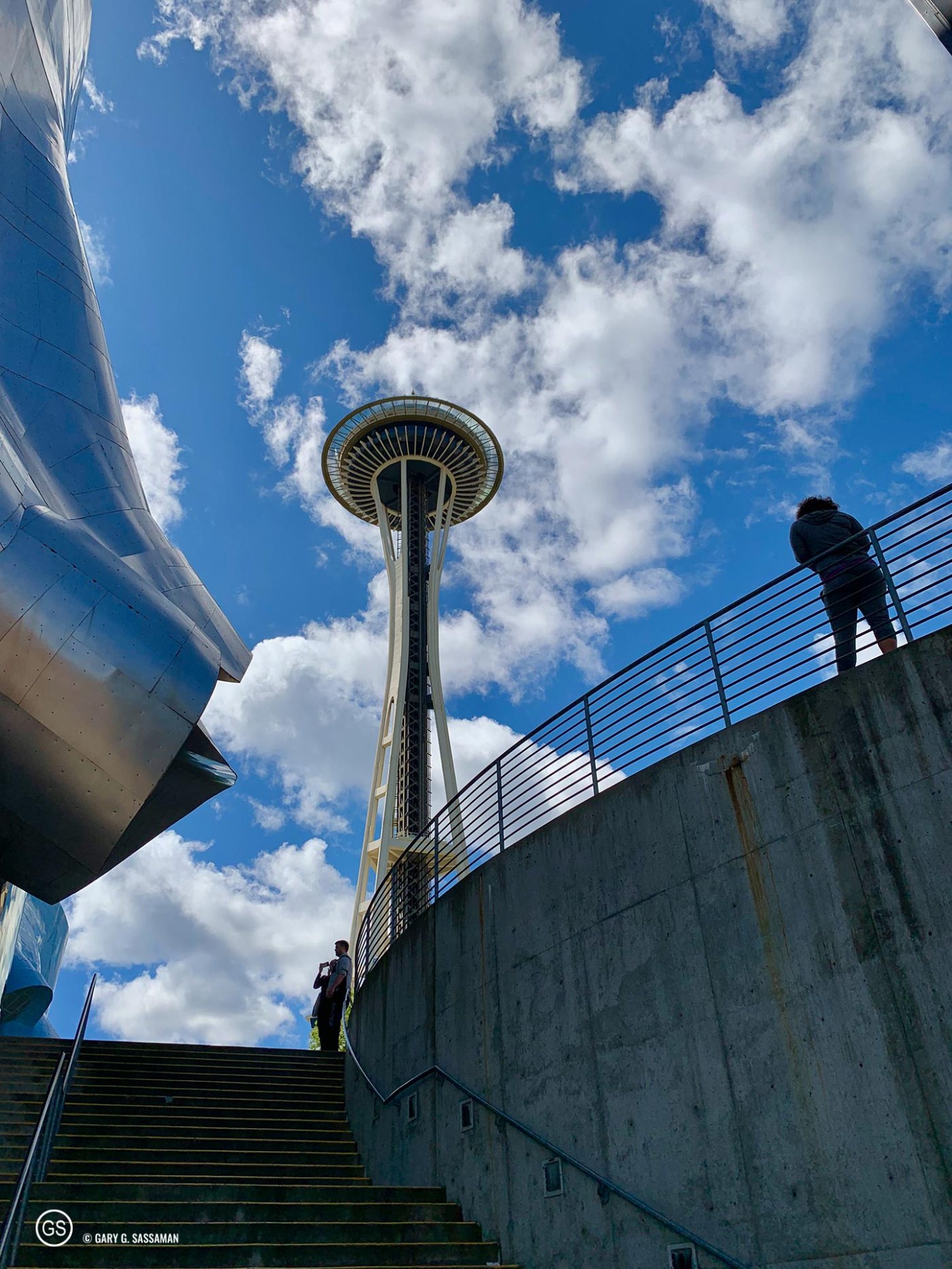 I took a ton of photos during my recent trip to Seattle and this is my favorite of the bunch. I’m not sure why. Maybe it’s the dramatic composition, maybe the mystery of the two people who seem oblivious to my picture-taking and into their own little worlds. Maybe it’s the futuristic rise of the Space Needle and the other-worldly metal look of the Museum of Pop Culture juxtaposed with the staircase. I dunno. I just like it.