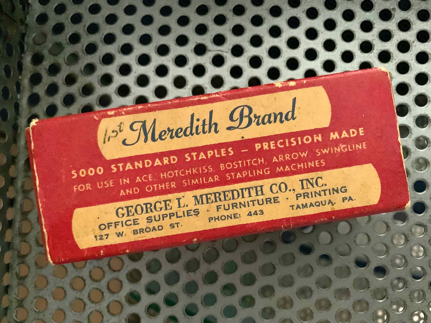 My grandfather was George L. Meredith, and he owned a stationery store and print shop on Broad Street—the main drag—in downtown Tamaqua (that’s a painted—and somewhat faded—sign on the back of the building on Rowe Street, pictured above). It was a business he worked at and built up over decades, and his two sons, John and Louis, and my mother, Jane, also worked at the store in various times of their lives. My mom quit after the war, when she had my brother and me, to be a full-time homemaker. John and Louis, or Uncle Louie as we called him, were part of the business all their lives.