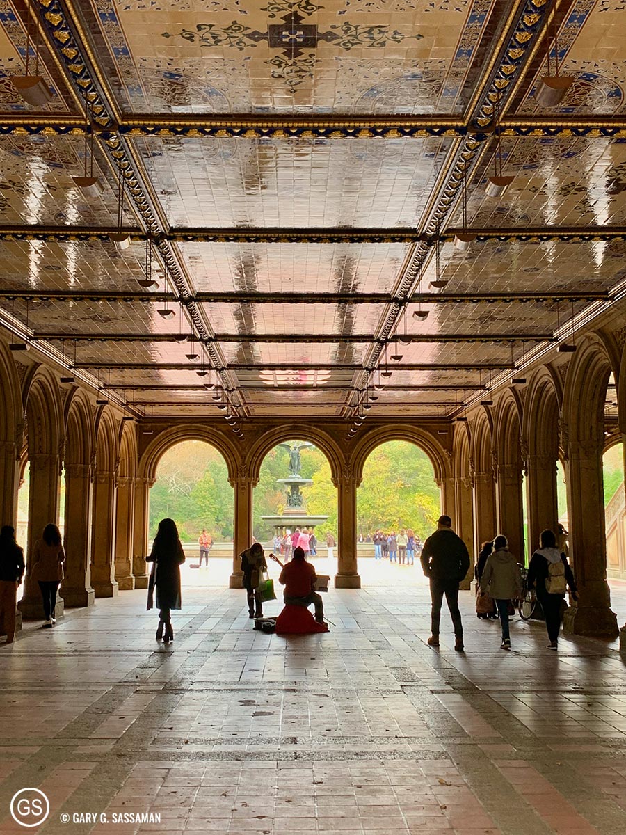 The passageway that leads from the steps to Bethesda Fountain in Central Park. There always seems to be a musician (or busker as the Brits call them) playing here, probably because of the sheer amount of people who roam through each day and also the sound quality in this enclosed space. It lays just at the end of the Mall, the wide, tree-lined pathway that cuts through the middle of the lower end of the park, below the 72nd Street cross way. I always try and walk through here when I visit the park.
