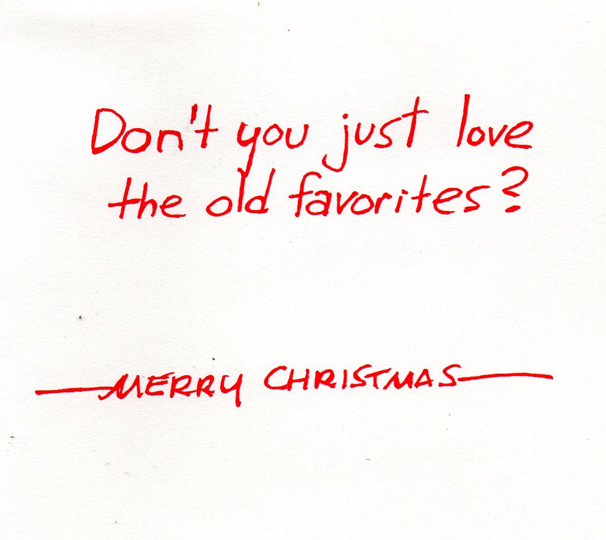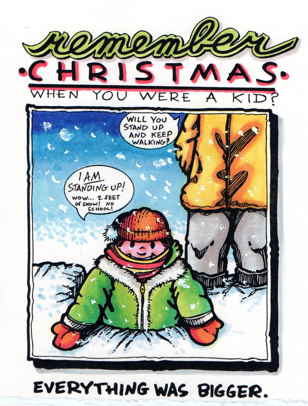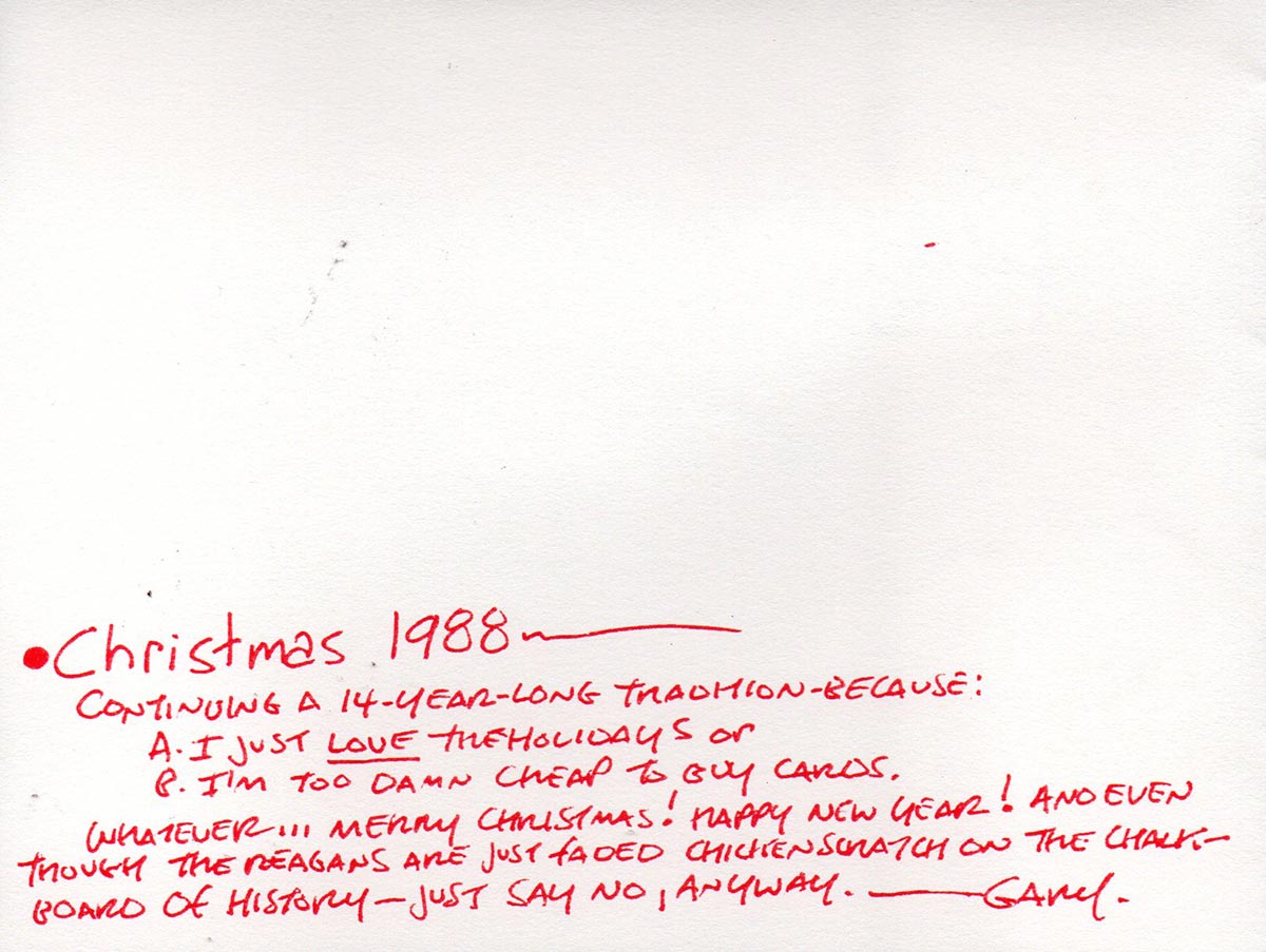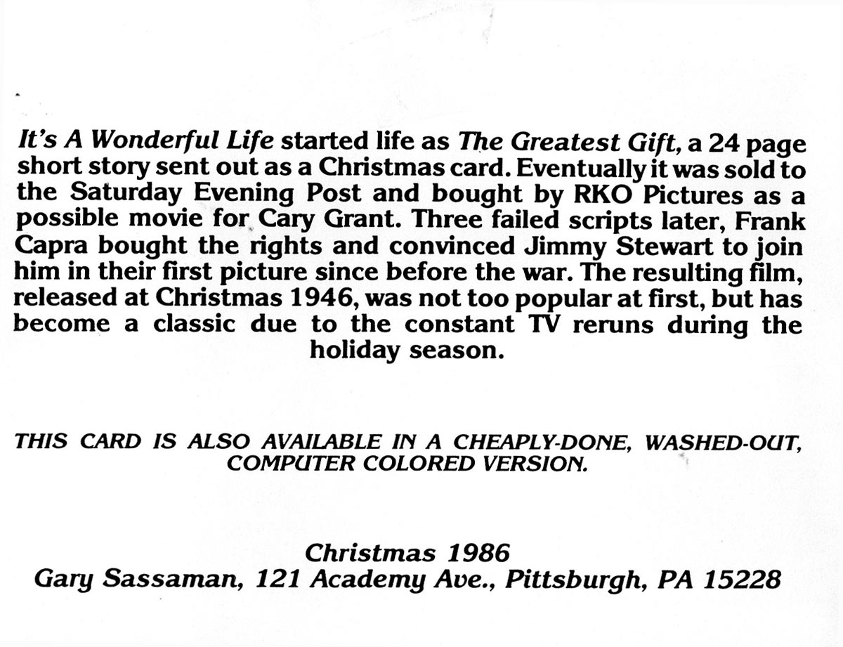 It’s A Wonderful Life celebrated its 40th anniversary in 1986 and someone somewhere (maybe Ted Turner at TBS?) decided to colorize it with new technology. A popular holiday staple on TV for years, there was absolutely no reason to do this, and I took it upon myself to editorialize on this on the inside of the card … another long journey to a lame joke. I was good at that. 2021 is the 75th anniversary of the movie and once again there’s a newly-colorized version. Just show the damn movie, okay?