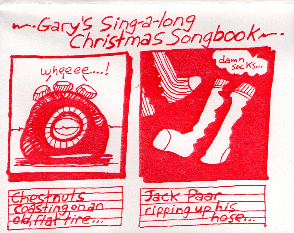 This is one of my favorite cards, and it showed up as a one-page comic strip in Innocent Bystander #1 in 1995. I believe my work upgraded to a color Xerox machine at this point and I took full advantage of its capabilities. I also love the nostalgic aspect of this mini-story and the coloring. This was printed on 8.5 x 11″ paper and folded twice to make a little booklet.