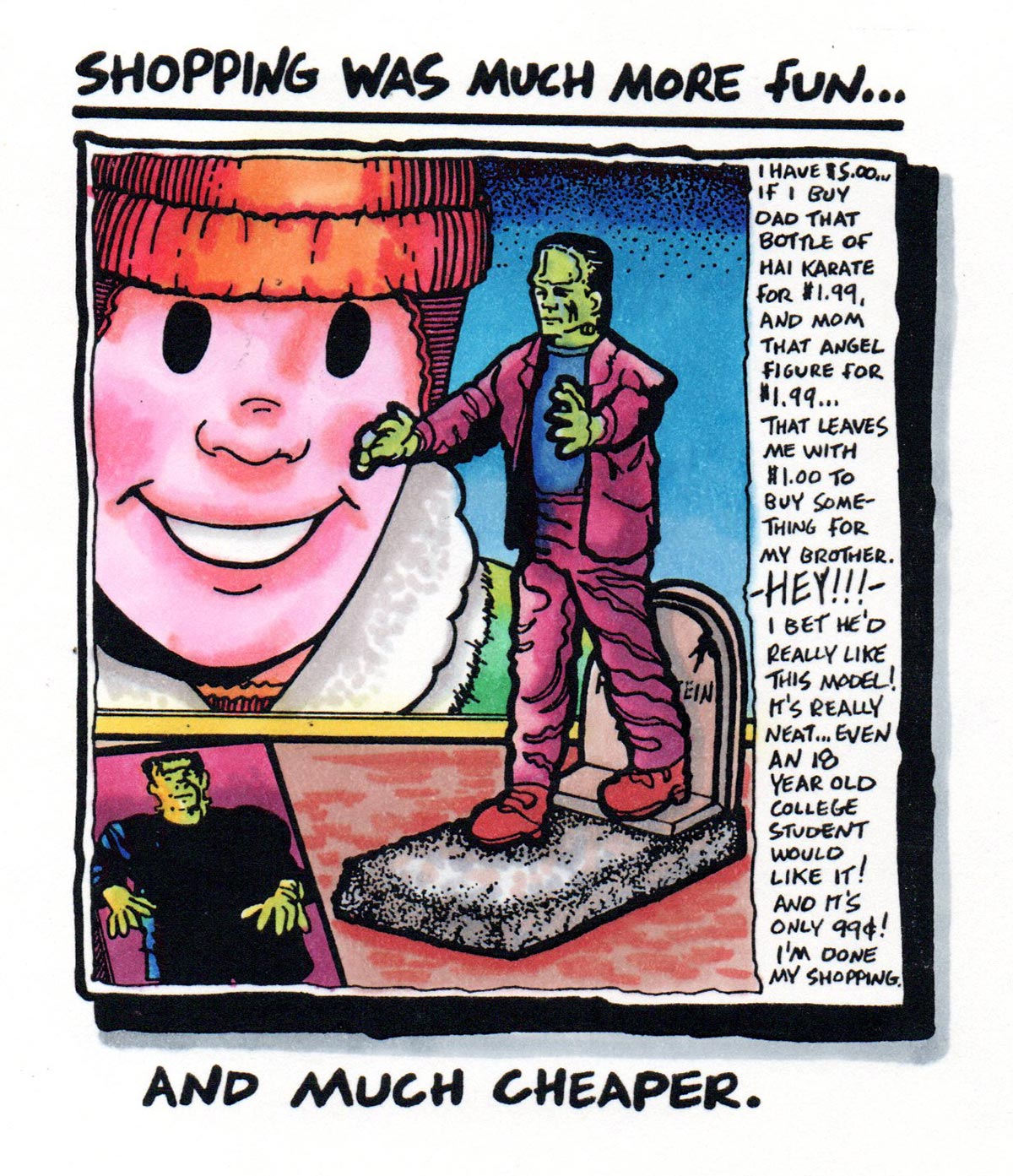 Hills was a discount department store chain that made K-Mart seem like one of the great London department stores. Also, this is the first appearance of my cats, Stan and Ollie, who I got as kittens in 1985. This first look foreshadows their comic book counterparts in my self-published series, Innocent Bystander, starting in 1995. (Stan would not be happy with this drawing—he’s the lap cat—but Ollie is spot-on, echoing the eventual logo of my publishing empire.)