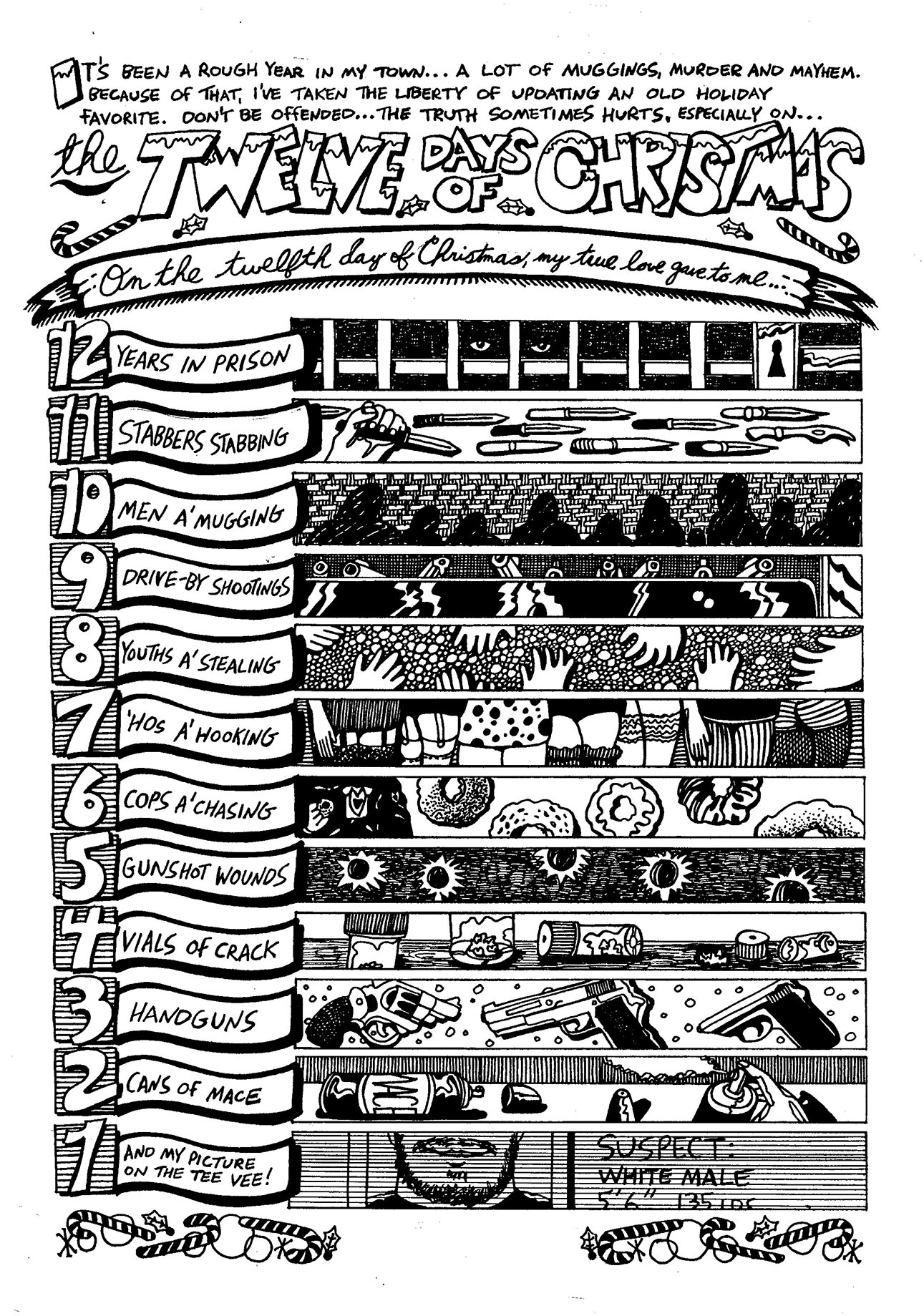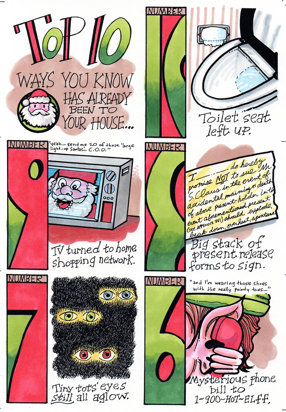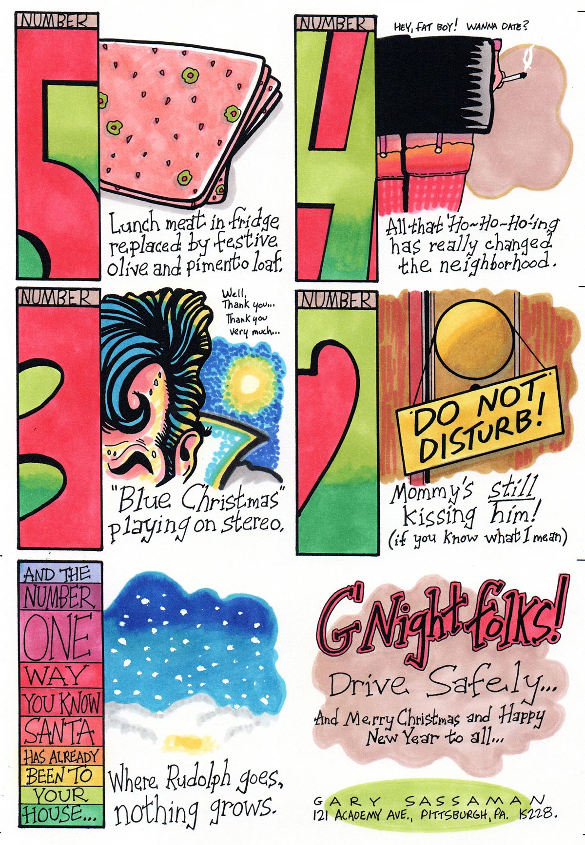 Hookay. This one was definitely influenced by my job as a graphic designer in television news. All that death and destruction gets to you after a while, I guess. Also, not exactly PC-perfect. This one also became a page in my first issue of Innocent Bystander, my self-published comic book series, in 1995 (as did the 1994 card, albeit in black and white).