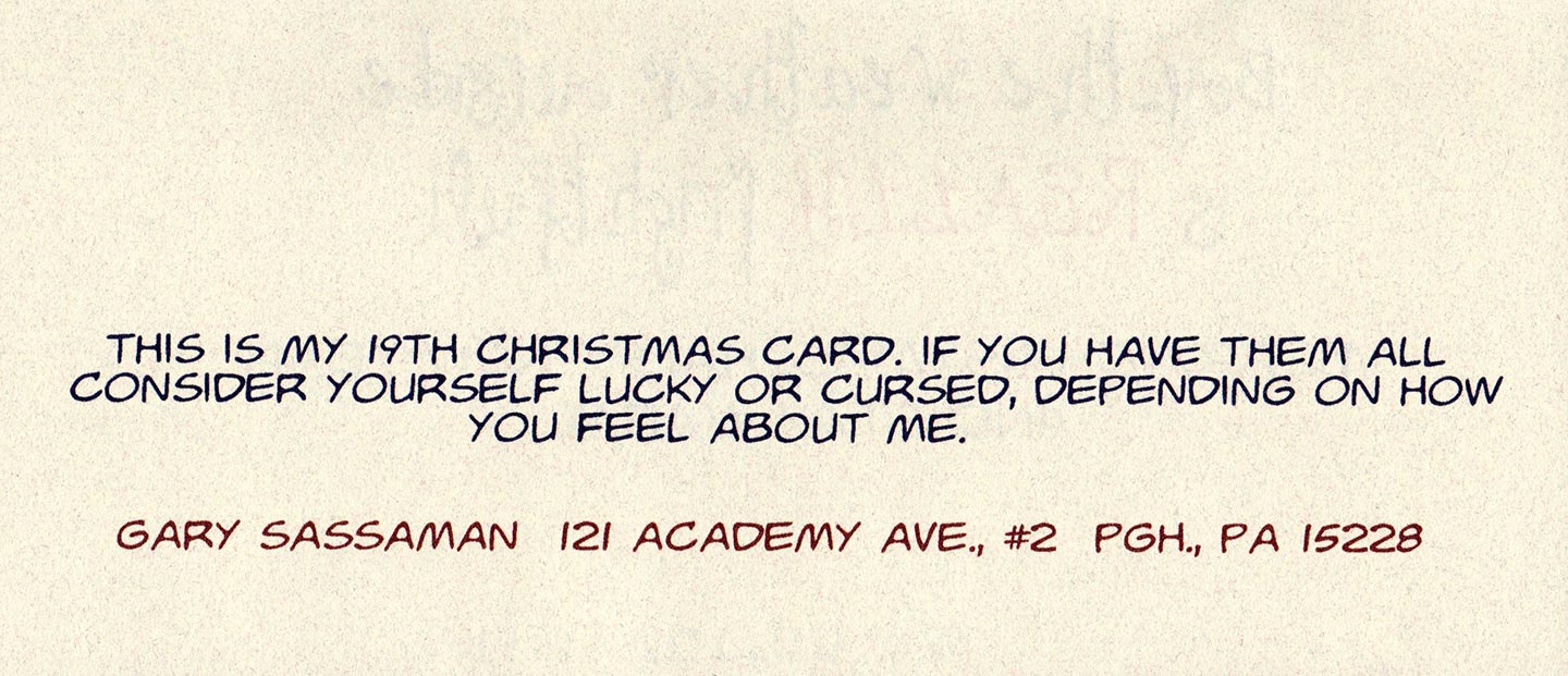 Judging from the response I’m receiving comments-wise, nobody really gives a good rat’s ass about this particular brand of navel-gazing on my part, but since I started down this road, I’m damn well sure I’m going to finish the journey and bring it home. So steel yourself for even more cards and yes … there is a part 4 coming on Christmas Eve!