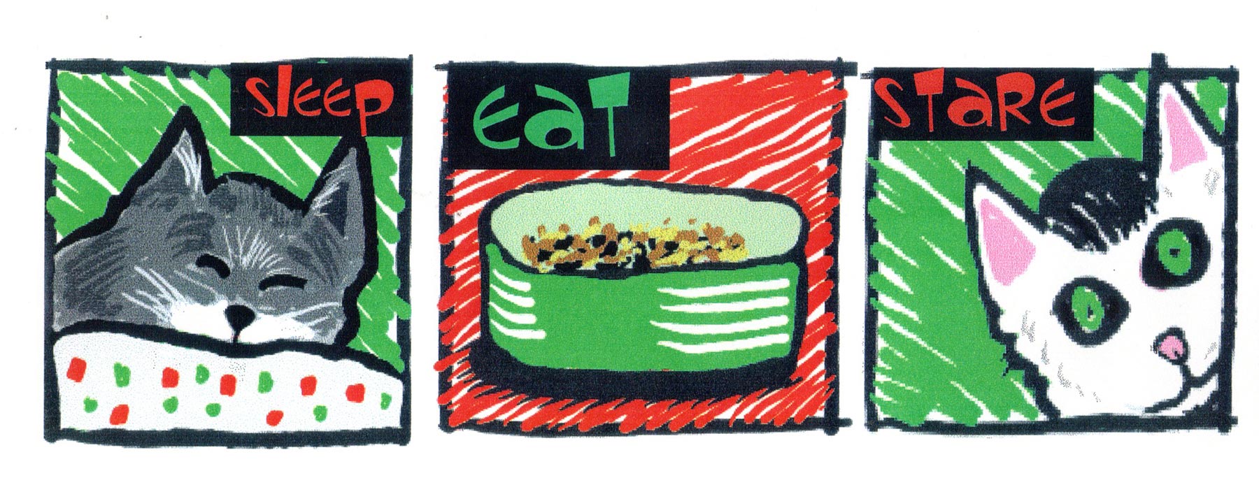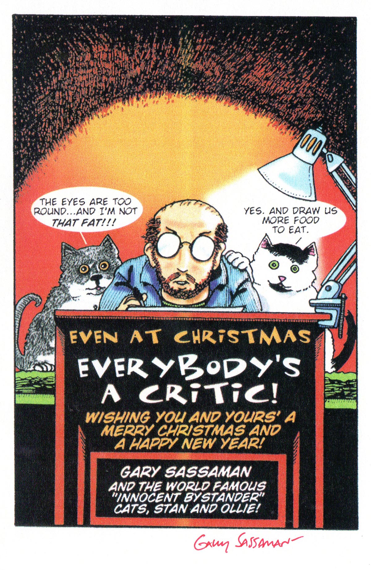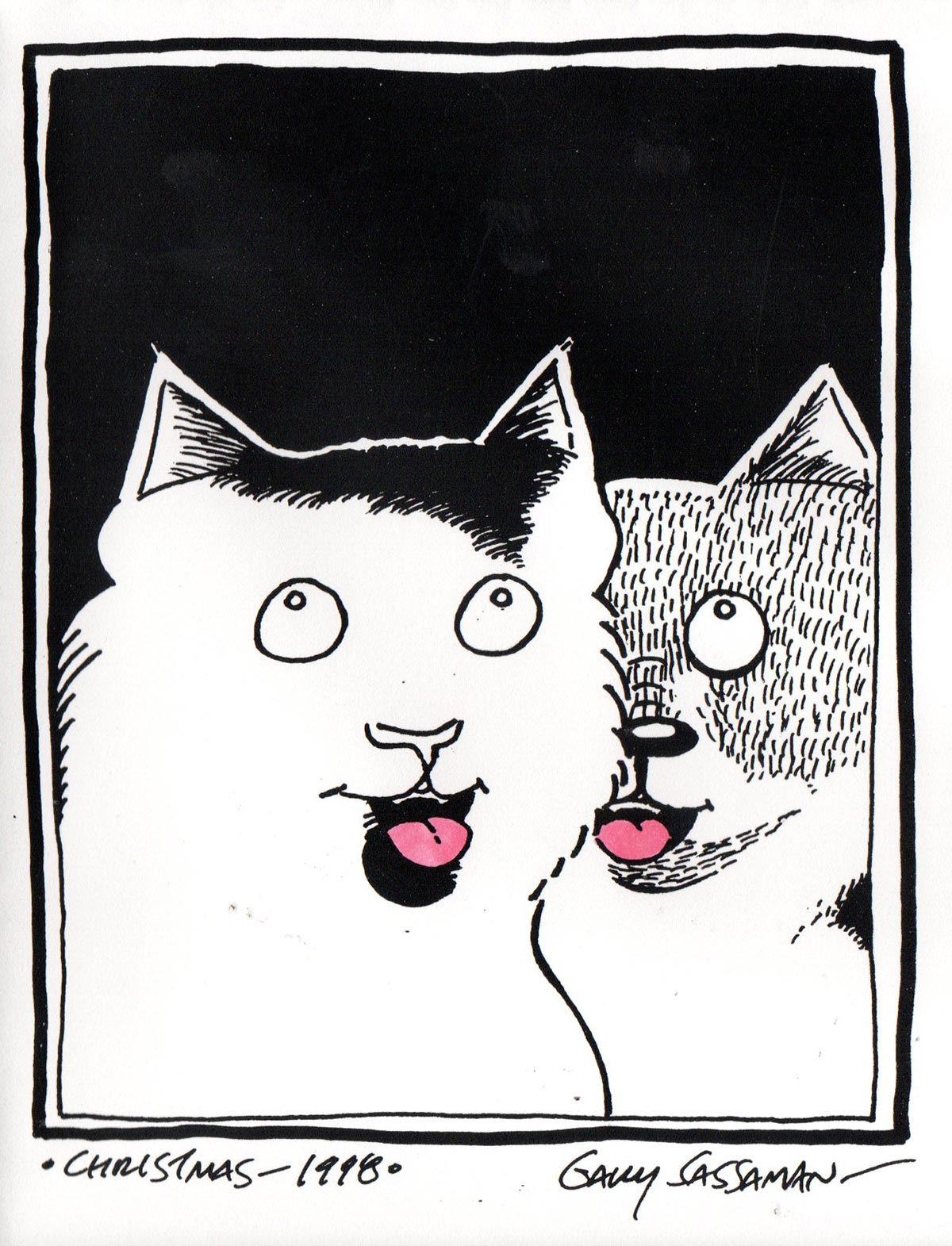 My cats, Stan and Ollie, increasingly took center-stage on both my cards and in my comics (eventually taking over a full issue of Innocent Bystander, #4). This was designed as a three-fold sheet of 8.5×11″ paper and done on a computer (although god only knows what computer I was using in 1997).