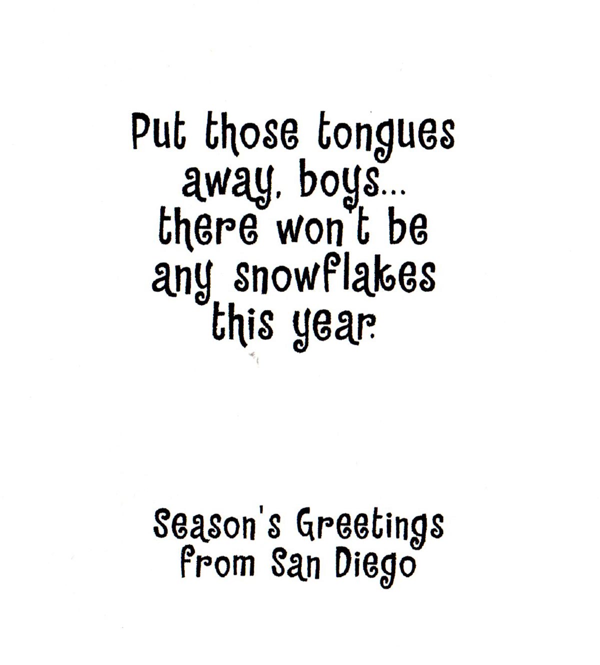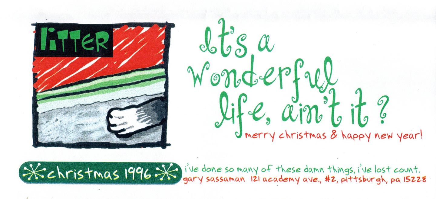 This is one of my favorite cards and if memory serves me right, I created it on a Quantel Paintbox, a high-end graphics tablet designed for TV news graphics. It also became the back cover for issue #2 of Innocent Bystander, which premiered in June of 1996. (Click here to read more about that issue.)