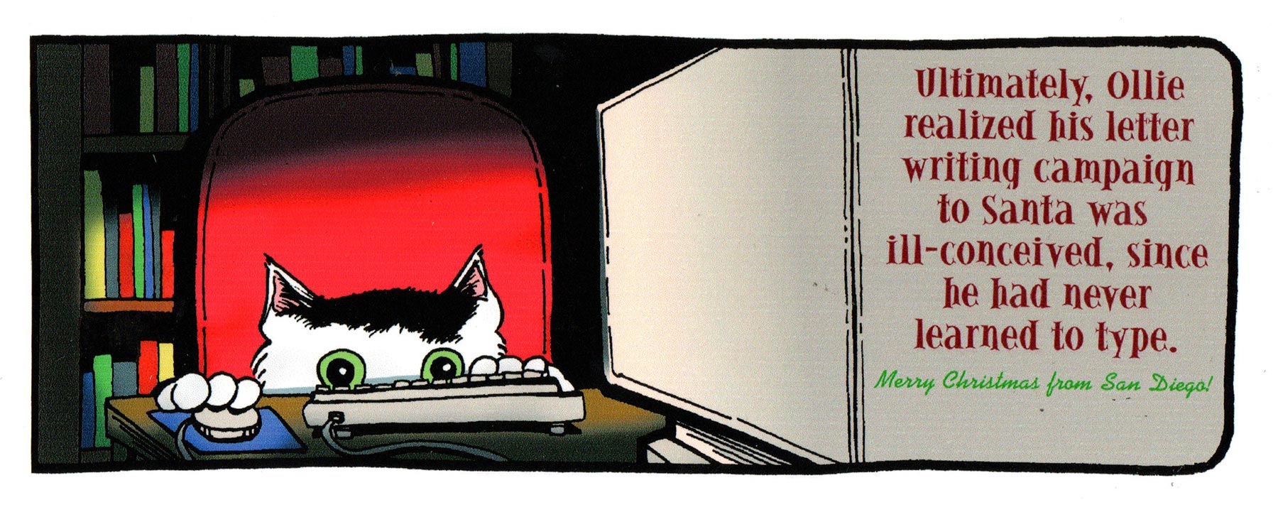 Ollie took center-stage in this card, which—if I was doing today—would have included the line: “However, he does enjoy playing with the mouse.” I think I printed these out on my home printer, three to a page, and cut them out since I was pretty broke by then. I got two new jobs in summer 1999, working for local TV station KUSI (I HATED that place) and doing freelance for San Diego Comic-Con, which was the writing on the wall for my future for the next two decades.