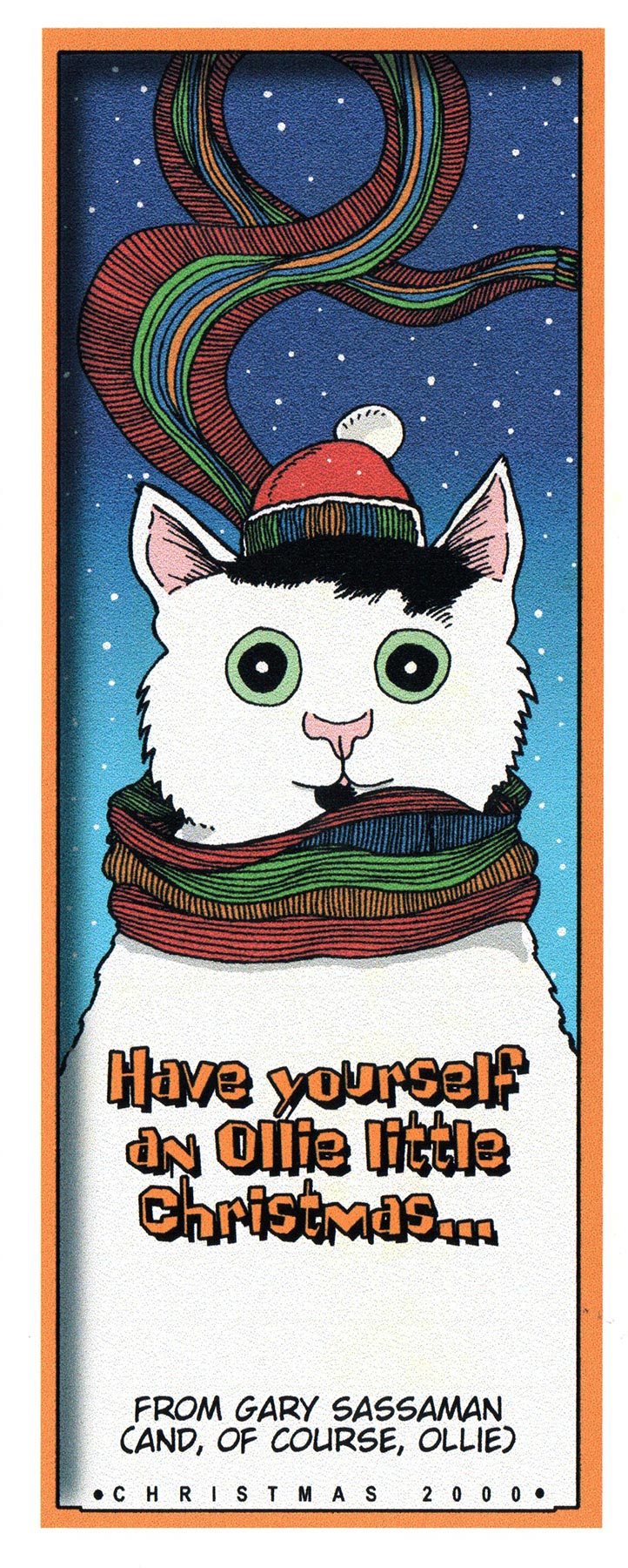 My favorite of all the cat cards I drew. Ollie was still with me at this point (he passed away in 2002, after four years as a solitary cat). In reality, though, he never wore scarves, let alone ones of Doctor Who dimensions.