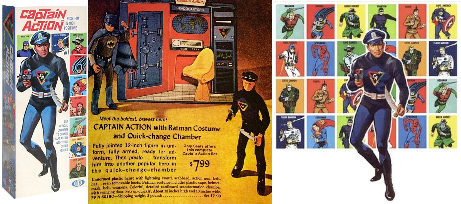 Top: The Man from U.N.C.L.E. guns and the Horrible Hamilton playset, complete with cardboard “Hamilton Invaders” cave; Bottom: Captain Action’s original box and all his original costume character sets (far right). Sadly, while I had the Batman costume, I didn’t have the Sears-exclusive “Quick-Change Chamber,” which was a misnomer at best. I’m pretty sure it did nothing. Changing Captain Action’s costumes was tedious and downright embarrassing.