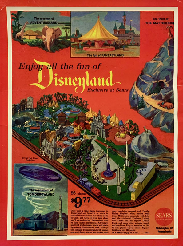 My Christmas gifts, especially from my maternal grandparents, usually revolved around the aforementioned Sears Christmas Book. The catalog arrived in late summer and I would spend hours pouring over it at my grandparent’s house, trying to decide what one big item I wanted. For a while playsets were big. My brother had an Alamo set, with a tin recreation of the famous building and numerous cowboys, soldiers and horses, along with various cannons. I opted more for fantasy over reality (although I admit to having a D-Day set with hundreds of green plastic soldiers). Two of my favorites were a Flintstones town (complete with Fred, Wilma, Barney, Betty, Dino and Pebbles, plus houses, dinosaurs and cars) and a Disneyland one that came with its own Matterhorn and a small car that raced down its plastic sides, along with small plastic recreations of areas of the park, including Adventureland, Fantasyland, and Tomorrowland.