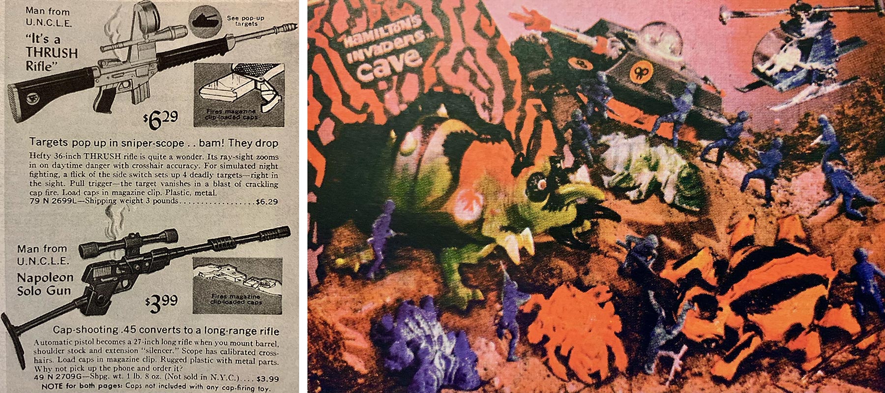As I got older, my interests turned to more “adult” kid things … like guns. I was obsessed with the James Bond movies and its TV equivalent, The Man from U.N.C.L.E. I never got the Bond toy of my dreams, the fully-loaded attache case (a kid down the street from my grandparents had one, though and I desperately wanted to steal it), but I did have the U.N.C.L.E. guns, both the modular Napoleon Solo one and the giant T.H.R.U.S.H. rifle, which was almost too big to play with. One year a REMCO playset called “Horrible Hamilton” was all the rage and I got that, along with a helmet and gun. The theme was giant insects and my mom hated them. They had strings you pulled and they slithered around the floor. The playset came with blue plastic soldiers and futuristic vehicles, too. That fad lasted about a year and was about a decade too late … the giant monster movie craze had its last gasp in the late 1950s.