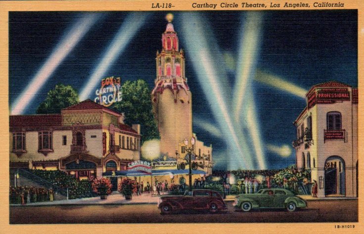 Here’s the famous Carthay Circle Theatre, home of many movie premieres, including Snow White and the Seven Dwarfs in 1937 and the West Coast premiere of Gone With the Wind in 1939. The theatre was torn down in 1969 to make way for an office building but a replica of it was built at Disney’s California Adventure Park. This scene shows the traditional spotlights for a gala movie premiere, blazing through the night sky. The card is unsent and is also a C. T. Art Colortone card, but listed as published by Western Publishing & Novelty Co., Los Angeles, CA.
