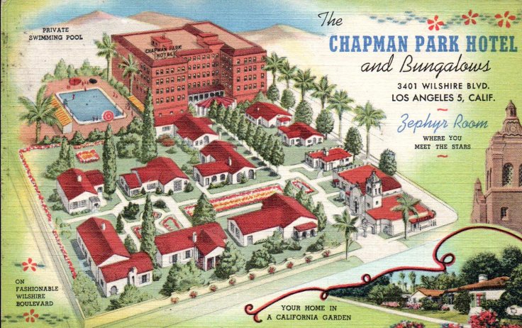 I love this colorful and intricate look at a bygone hotel, the Chapman Park Hotel and Bungalows in Los Angeles, CA, featuring the Zephyr Room, “Where you meet the stars” and lauded by Esquire magazine as “distinguished entertainment.” This is an unsent card and is a “C. T. Art Colortone” by The Allis Press, Kansas City, MO, but I suspect “C. T.” stands for Curt Teich & Company.