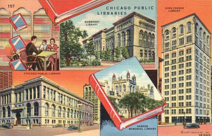 Here’s a card that promotes the “four leading libraries” in Chicago. It’s postmarked June 15, 1950. Only a book lover would send a card with libraries on it, I suppose, so this card holds special meaning to me. It’s sender wrote: