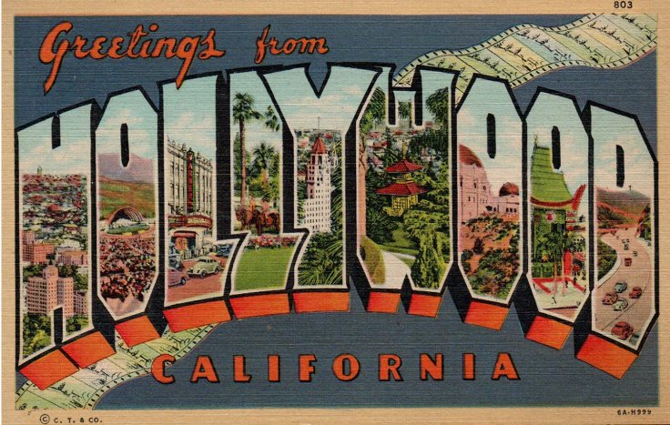 Speaking of Los Angeles, here’s another big letter Greetings from card, this one from Hollywood, California, the motion picture capital of the world. You can see the Warner Theater in the first L, the Griffith Observatory in the second O and Graumann’s Chinese Theater in the final O. This card was unsent and, like the one above, is a C. T. Art Colortone card.