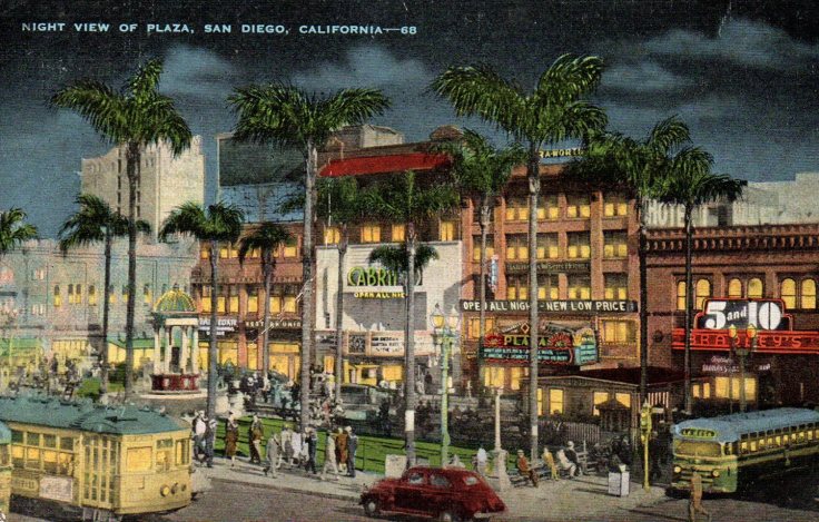 Finally, here’s one from my current hometown, or at least the hometown across the bay, San Diego, CA. This is the scene right up the street from where I used to live and right next to where I used to work, Horton Plaza, back before it was probably called that (it’s just called “the plaza” on the back of the card). This card is postmarked Sept. 11, 1946 and includes a message from Catherine: