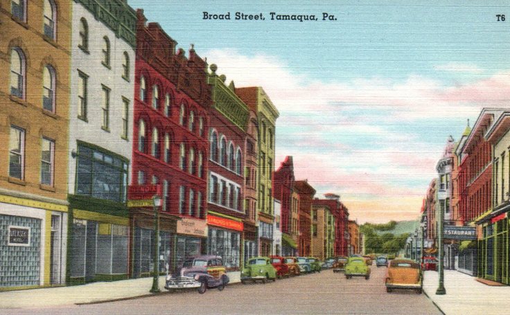 Here’s a card from my hometown, Tamaqua, PA. While it’s from before my time (looks like the late 1940s judging by the cars), I do recognize that bar with the glass block front on the lower left. I think there was a hotel above it. I have a few cards from Tamaqua, including the next one, below. This card was unsent and was published by the Mebane Greeting Card Company, Wilkes-Barre, PA.