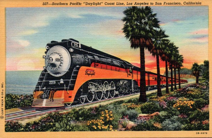I don’t normally collect train stuff, but the colors on this card are so stunning I bought it and have kept it all this time (probably over 30 years now). The back states “… Million Dollar Southern Pacific ‘Daylight’ speeds daily along the magnificent California Coast line between San Francisco and Los Angeles … No rail trip anywhere, unfolds more thrilling scenery—following the very edge of the Pacific Ocean for more than a hundred miles.” The card is unsent and is also a C. T. Art Colortone card but listed as published by Western Publishing & Novelty Co., Los Angeles, CA.
