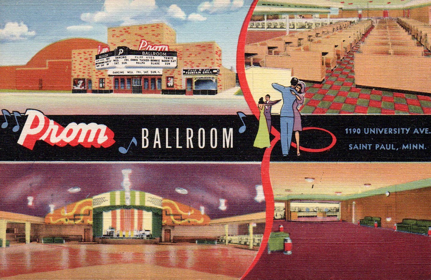 This unusual and colorful card showcases the Prom Ballroom in Saint Paul, Minnesota. It’s unsent and there’s no info on the back other than a faded hand-stamp that partially reads ” dancing every night except Monday.” This is also a “Genuine Curtteich-Chicago Colortone’ Post Card”.