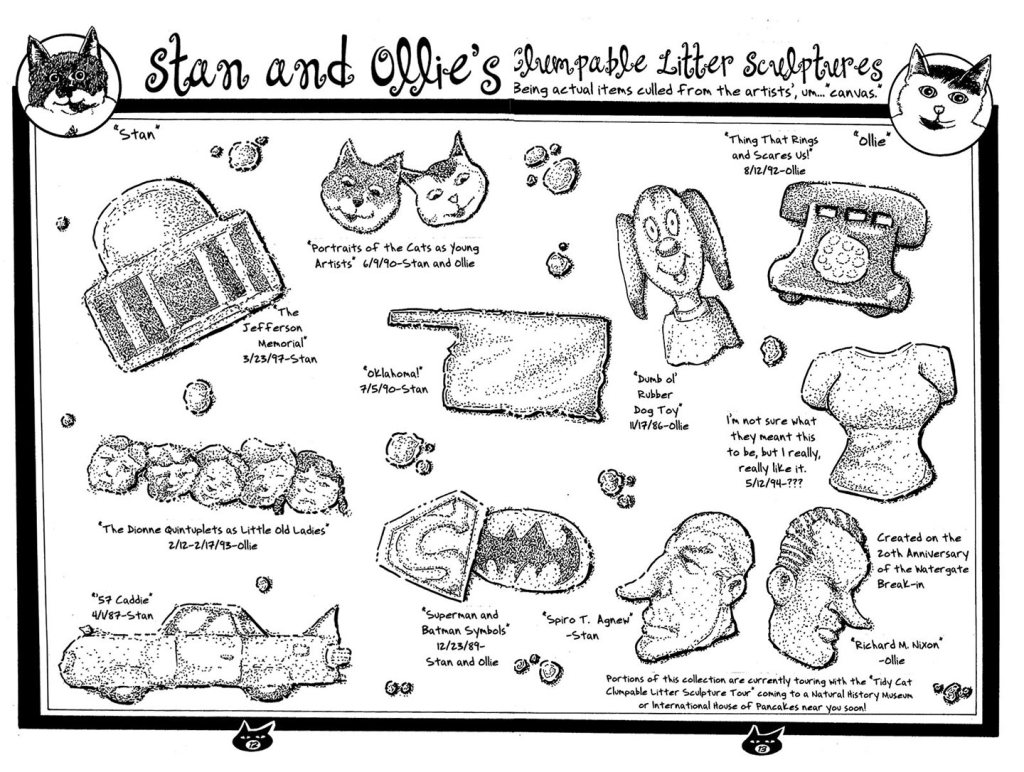 I was endlessly entertained by them and they became cannon fodder for quick, one-, two- and three-page stories for Innocent Bystander. So it was relatively easy for me to crank out another issue so quickly. There wasn’t a lot of depth to the stories, just anecdotes and flights of fancy. For a while, I fantasied about doing a comic strip with them, so there are a number of pages devoted to that concept. Some were simple, slice of life, living with cats vignettes, others were from the cats’ perspective. The litter box loomed large in this issue, as it did in real life; anyone that has cats can tell you that they poop and pee A LOT, and in the days of Tidy Cat clumping litter, shapes and forms began to emerge. (Okay, the only one below that was true-to-life was—I swear—Oklahoma.)
