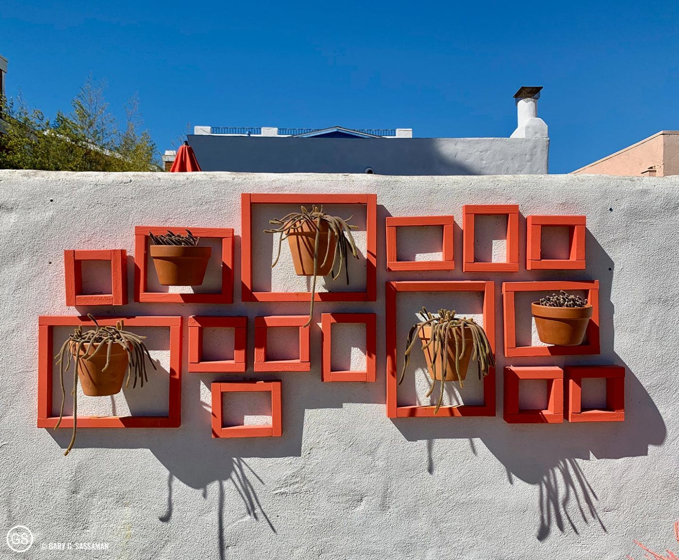 I love displays of all types and this lovely garden wall here in Coronado caught my attention for a number of reasons, including the orange frames with the blue sky color-combo, and just the kind of randomness of it. If I did it, it would all be gridded-out, lined-up, and orderly, so I intensely admire this person’s artistic vision and definitely wish i could be so unbound.