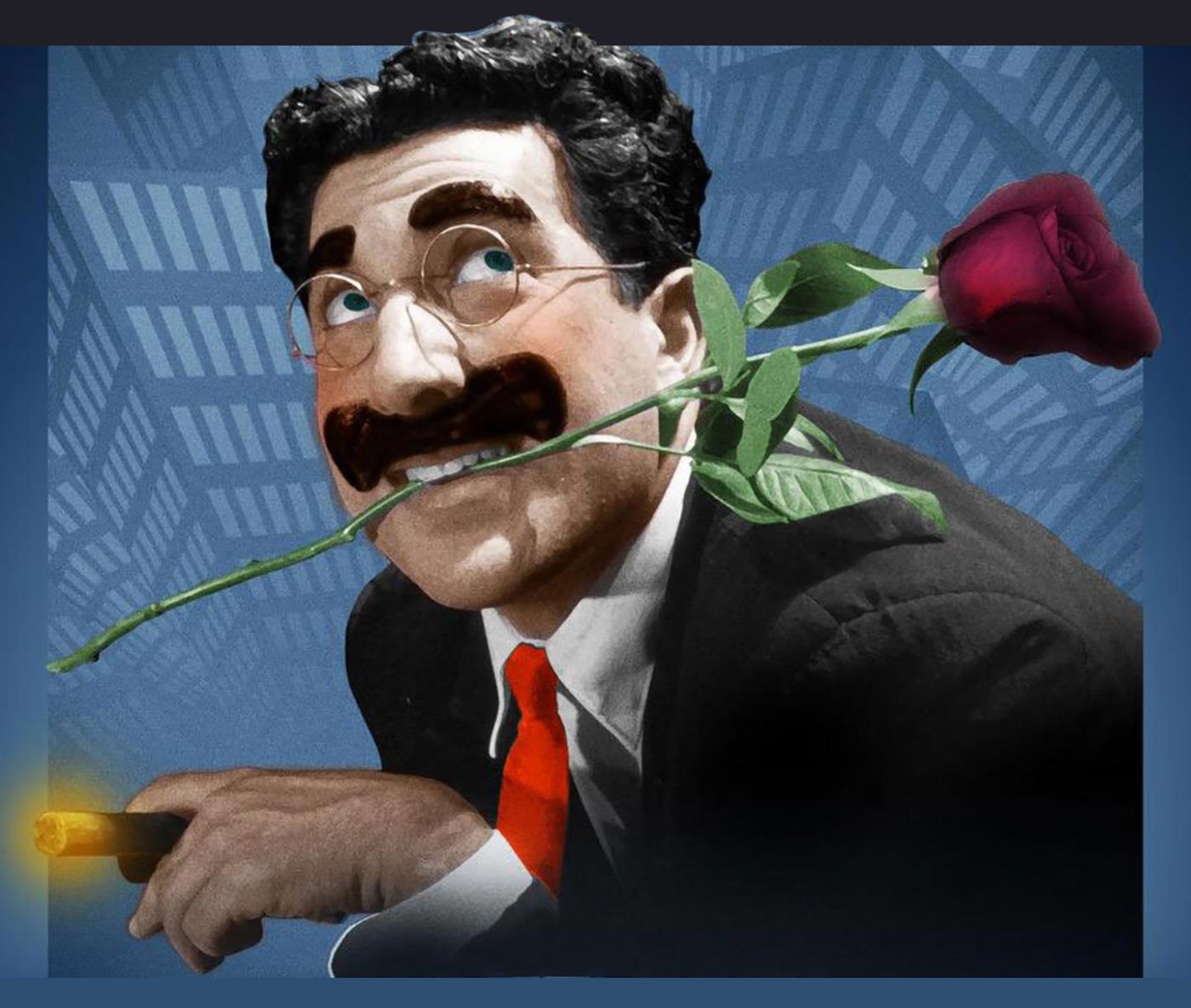 In this filmed version of the play in Cincinnati, OH, it’s Bonnie and Terry, a couple married for 49 years, and Frank’s interaction with them is priceless, seamlessly going from his scripted portrayal of the Groucho we know and love from the movies to simultaneously channeling the Groucho we know and love from his TV series, You Bet Your Life, in which he interviewed ordinary people and made gentle—and sometimes not-so-gentle—fun of them. While Frank keeps on his “Movie Groucho” make-up the entire time (glasses with grease-paint mustache and eyebrows), it’s these moments with the audience that evoke the elder Groucho’s decade-long TV stardom.