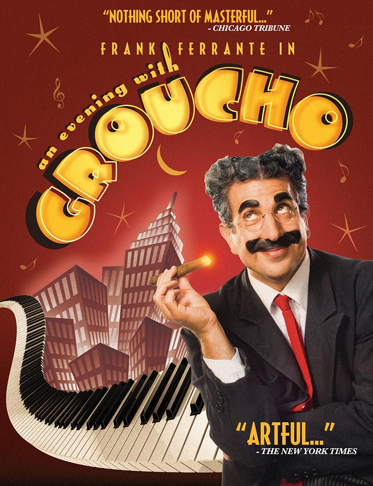 I spent a most enjoyable evening with Groucho Marx the other night. Yes, he’s been dead for well over four decades now, but his spirit lives on in writer/actor/director/producer Frank Ferrante, someone I’ve known for close to three decades (that’s a lot of decades for one paragraph). A new filmed version of Frank’s wonderful one-man show (two-man if you include musical accompanist Gerald Steinback, and you probably should) is now making the rounds on PBS and is also available as a DVD. Compiled from a quartet of filmed live shows, An Evening With Groucho has been performed by Frank over 3000 times in more than 500 cities over 35 years … and I can guarantee you each time was different and special in its own way.