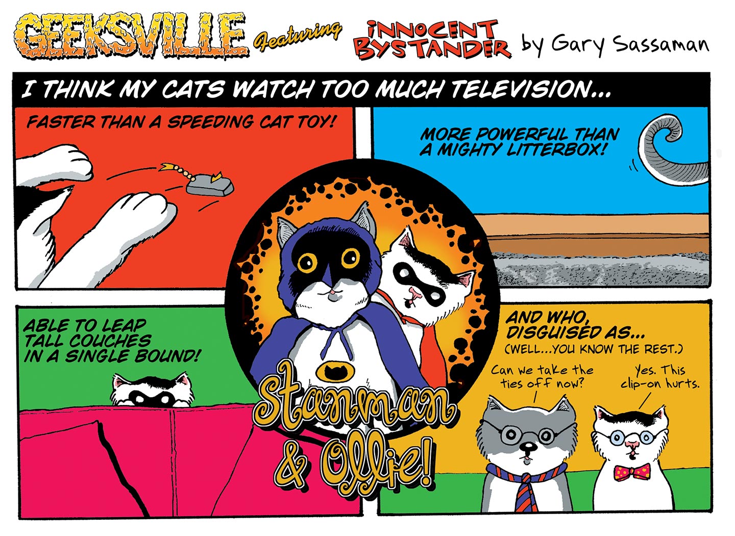 Here’s the fourth in a series of five original comic strips I did for Comic Shop News, the weekly newspaper distributed to those comic shops willing to pay for copies. (It used to be something ridiculously cheap, like five cents a copy; not sure what it is now. I still find new issues in comic shops when I travel to cities like New York.) When Geeksville first started, the editors of CSN (who were hugely supportive of Innocent Bystander) asked Rich Koslowski and me to produce a weekly series of comic strips. I think we did at least ten (five each). I’ll be posting all the ones I did over the next few weeks here on the blog. For more info click here to read the Geeksville installment of my ongoing series “My Life in Comics” … and to read the whole series, click the “My Life in Comics” link in the category list on the right.