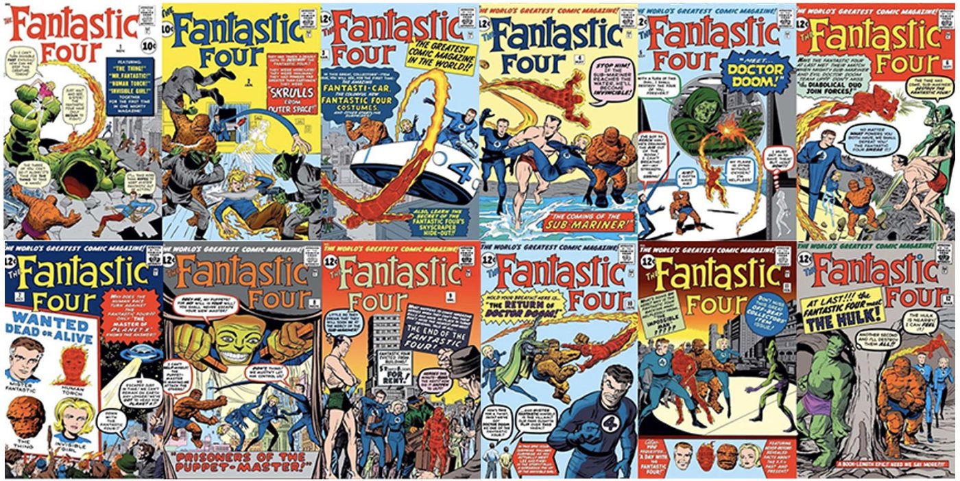 As I delve into my 20+ years at Comic-Con in my series “My Life in Comics,” our new banner image for the blog for the next few months features “The World’s Greatest Comic Magazine,” the Fantastic Four. This comic book series by Stan Lee and Jack Kirby had a profound and lasting effect on my life. It was the comic that made me realize someone—in this case, Lee and Kirby—actually wrote and drew these stories that I enjoyed so much. And through his incessant promotion (both self- and company-oriented), Lee inspired a feeling of community, of belonging to something, of being more than just a reader of Marvel Comics. That and the interconnected continuity separated the publisher from its rivals. Here are the covers of the first twelve issues of Fantastic Four, a mind-blowing assortment of a runaway freight train powered by the unbridled imagination of Jack Kirby teamed with the dialogue and editing skills of Stan Lee.