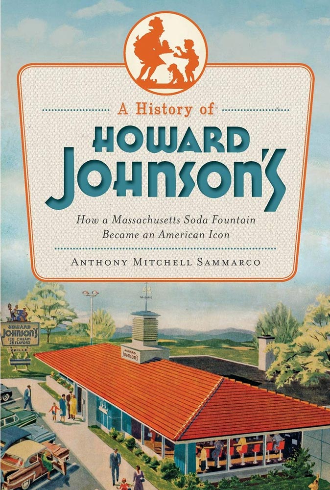 There is a great book on the Howard Johnson’s chain called A History of Howard Johnson’s: How a Massachusetts Soda Fountain Became an American Icon. It’s by Anthony Mitchell Sammarco, and was published by The History Press as part of their American Palate imprint in 2013. It’s well-illustrated, mainly in black and white with a 16-page color section, and even includes some classic HoJo recipes, including those “Special Frankforts;” no fried clams though. It also has a wonderful cover, utilizing a great piece of Howard Johnson’s advertising and their classic logo type. I don’t know who at HoJo’s decided on the orange and blue color scheme, but as far as I’m concerned, they’re a genius.