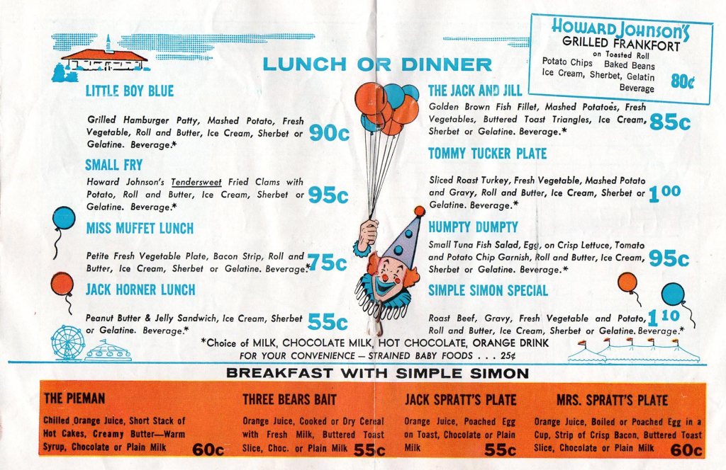 Howard Johnson’s Children’s Menu from Fun Book #13. I’ll have anything but the “Small Fry,” please. The “Humpty Dumpty” also reeks of long car ride back seat disasters.