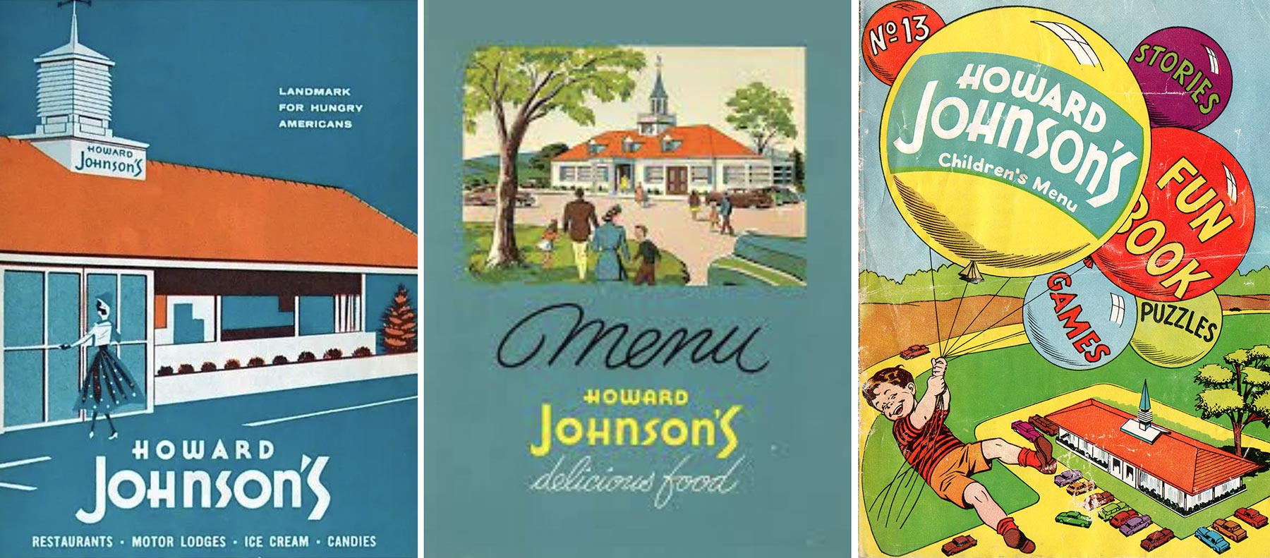 Some of the great Howard Johnson’s graphics, including what I believe was a brochure (left), a menu cover (middle), and their Fun Book, a combination of stories, puzzles, comics, and menus for kids. The cover and interior illos to #13 are by comic artist Kurt Schaffenberger.