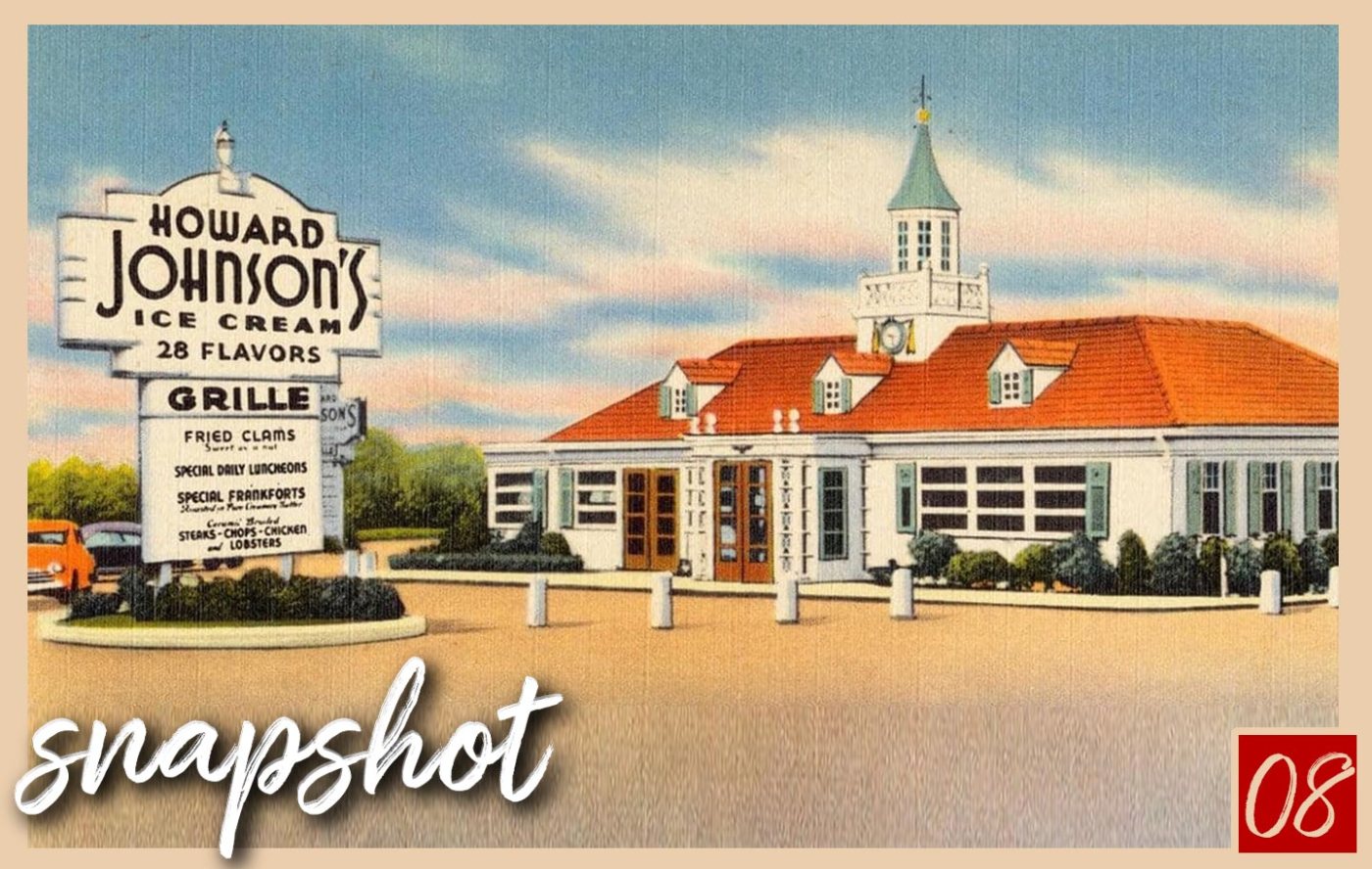 Howard Johnson’s was one of the first well-known restaurant chains and maintains a huge hunk of nostalgia for many people, not just me. It’s sad to see them be totally gone. I had a beautiful vintage menu from one of their restaurants that I sadly cannot find right now … I have no idea where it disappeared to, but somehow it seems fitting at this point in time, that it’s gone—like the restaurants—with the wind, just another part of the vanishing American landscape.