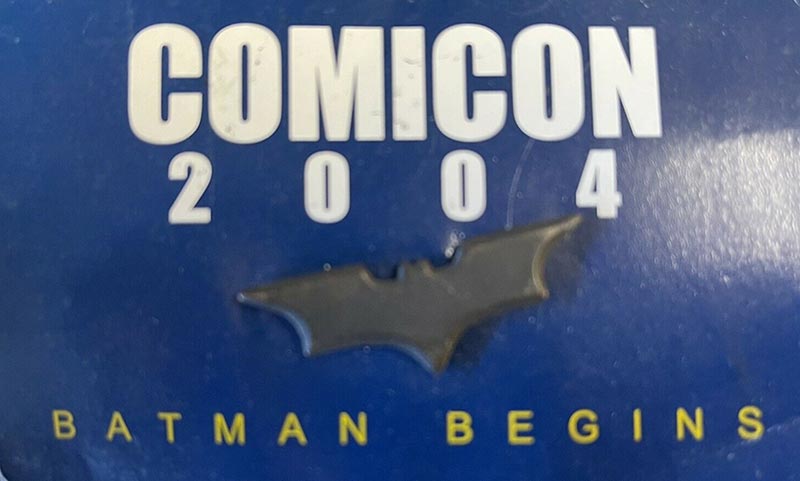 Hall H had its debut in 2004, and the very first panel was from Warner Bros. and featured Batman Begins (with screenwriter David S. Goyer and star Cillian Murphy) and Constantine (with director Francis Lawrence and stars Keanu Reeves and Rachel Weisz). WB was going to give out these cool little Batarang pins (see below), which came attached to a card backing. About a half-hour before the event was to begin, the publicist showed me the pins. “Aren’t these cool?” she asked me and I said, “Yes, they’re great … but you spelled Comic-Con wrong.” “What do you mean?” she asked. “It should be hyphenated, not one word, and you’re missing a C.” “OHMYGOD! WE’LL FIX IT! WE’LL TAKE ALL THE PINS OFF THE CARDS!” I said there’s no time for that, as the pins were kind of clunky with big needle-like fasteners on the back. “You’ll injure people handing them out without the cards and people removing them in a hurry will hurt themselves too,” I told her. The pins went out on the cards and I told her to just keep the correct spelling in mind for future giveaways, but I appreciated her concern. By the way, that pin is pretty rare now … there’s one going for $55.00 on eBay, if you’re interested, and no, I’m not the one selling it.