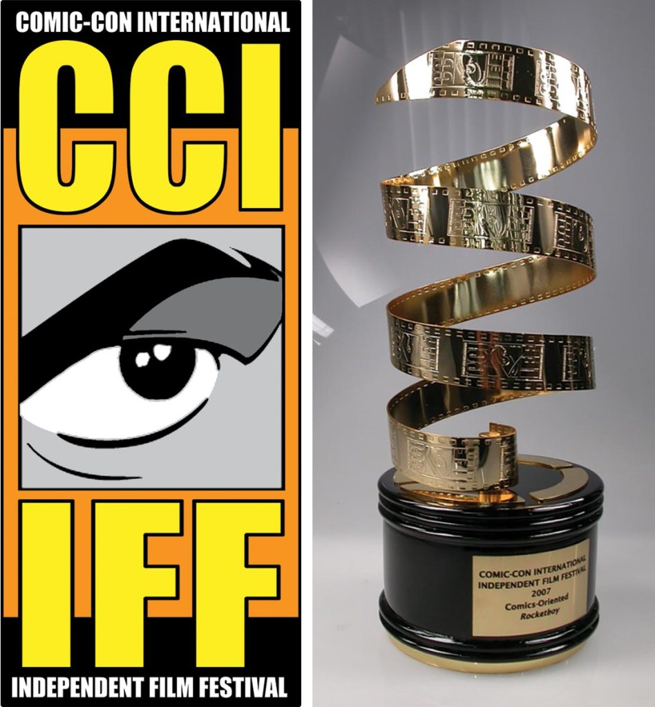 So I took the VHS movies home and watched them and some of them were pretty good. We started with a one-day event titled “Film Fest Friday,” and it slowly grew to all four days. During that time I added in a daily program to start all four days called “Comic-Con Film School,” which was run by filmmakers Sean Rourke, Valerie Perez, and Nick Murphy. The Film School provided valuable (free!) Info on everything from how to budget a film shoot to getting distribution for your final film and everything in between. The Festival might not be all bright lights and red carpets, but it provides a showcase for genre films, including action/adventure, pop culture documentary, humor, horror, and science fiction and fantasy, and at least one early entrant went onto a bigger-budget version of his film at a Hollywood studio. At one point we added juried prizes decided by a trio of film luminary judges and some pretty spiffy trophies, seen above next to the logo I designed for the event. I’m incredibly proud that both the CCI-IFF and the Film School continue to this day.