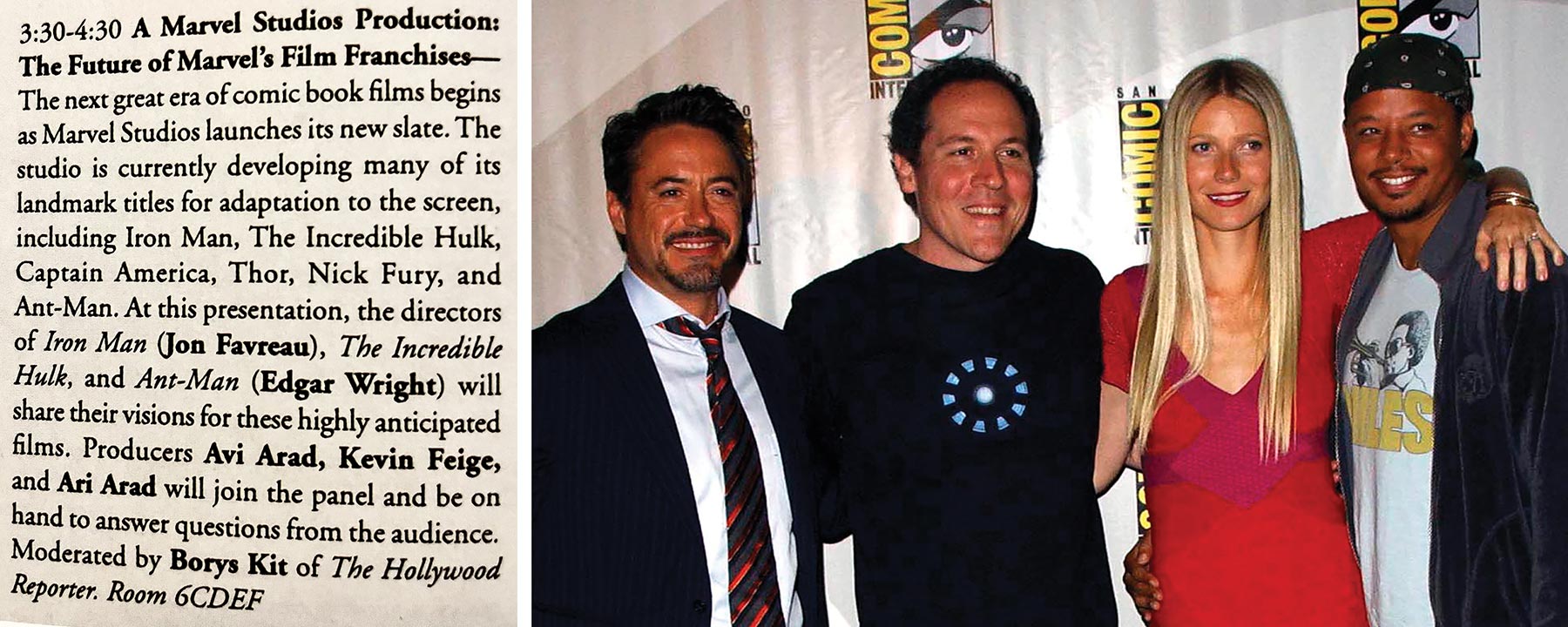 The first Marvel Studios panel took place on my watch in 2006 in Room 6CDEF. Featured on the panel were directors Jon Favreau (Iron Man), Edgar Wright (Ant-Man, alas never to see the light of day), and the surprise announcement of Louis Leterrier as the director of The Incredible Hulk. Marvel Studios head Kevin Feige was joined by Avi Arad and Ari Arad, still involved with Marvel at that point. This first, smaller panel was the beginning of a giant love affair between Comic-Con, the fans, and Marvel Studios.
