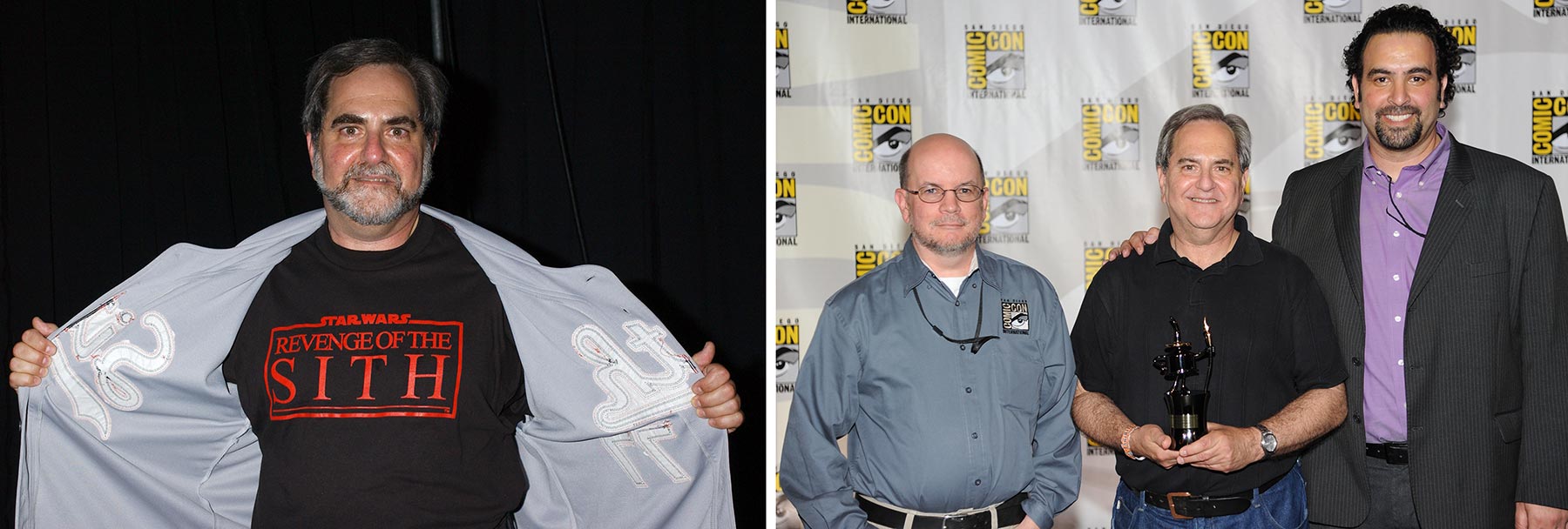 But in 2004, Lucasfilm picked SDCC to be the place where Steve announced the title to Episode III. When Steve revealed the title (Revenge of the Sith), he took off his shirt to reveal a black T-shirt under it with the movie’s logo on it, and proudly announced that the T-shirt was now on sale in the Lucasfilm Pavilion … which of course resulted in a near-stampede as people emptied out of a full Hall H to try and get a shirt. But I forgive you, Steve … over the years, you were a great friend to and advocate for Comic-Con and I was proud to give you—alongside present senior director of programming Eddie Ibrahim—the Inkpot Award for fandom services during the final Fan Film Awards event at San Diego. (Steve runs a wonderful nonprofit museum in Petaluma, CA, Rancho Obi-Wan, which houses the Guinness Book of World Records certified largest Star Wars memorabilia collection in the world. Click here for more info.)
