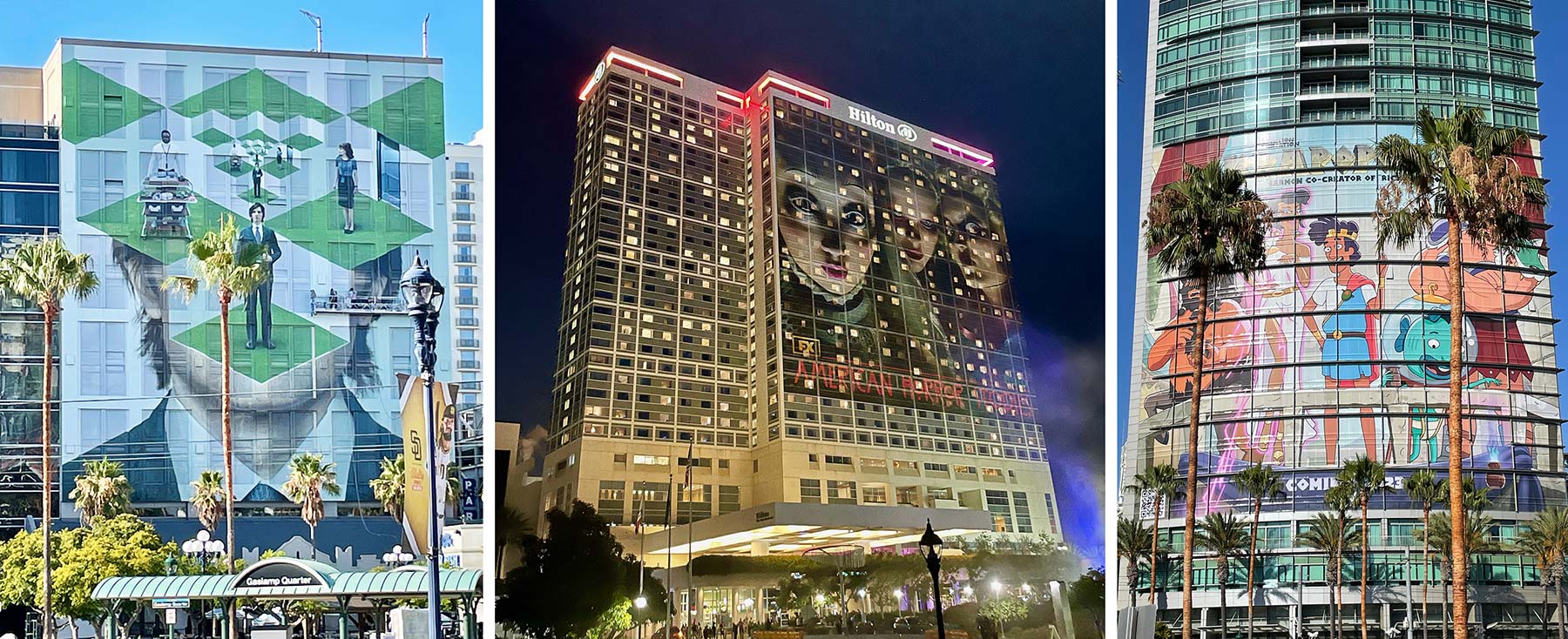 Some of the hotel wraps around the Convention Center, including (left to right) Apple TV’s Severance on the Hard Rock Hotel; the creepy doll faces for American Horror Story seemed even creepier at night on the Hilton Bayfront; and a hard-to-figure-out exactly what this Fox-oriented wrap was advertising on the Omni. Still, it’s great to see this kind of thing back in full force; there was also a Teen Wolf movie wrap, some Walking Dead stuff at the Hilton Gaslamp, and an all-encompassing Star Trek/Paramount+ wrap on the top of one of the Marriott towers. (I’m probably missing a few.)