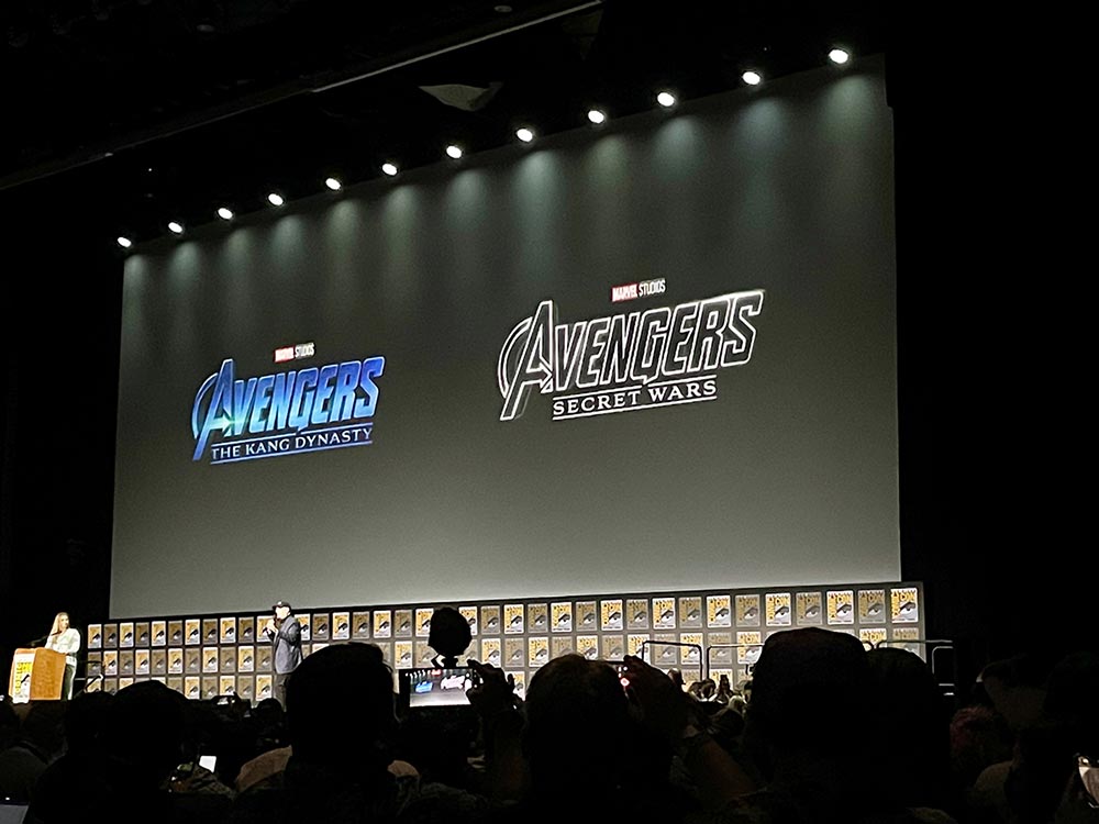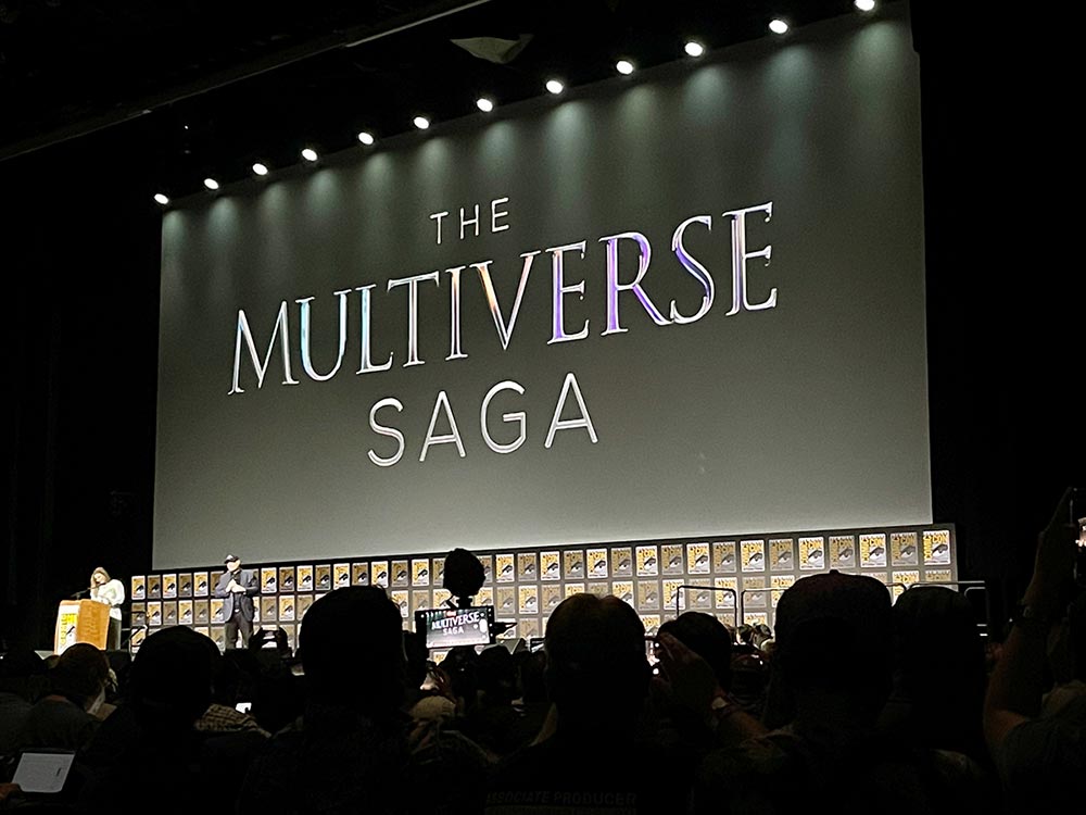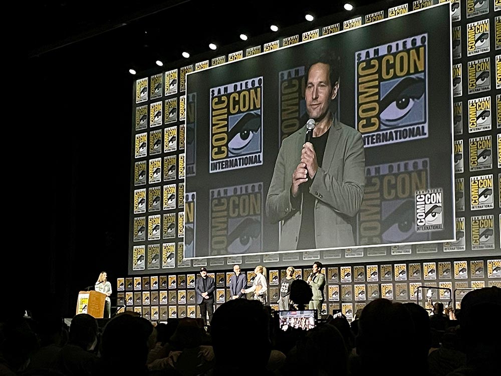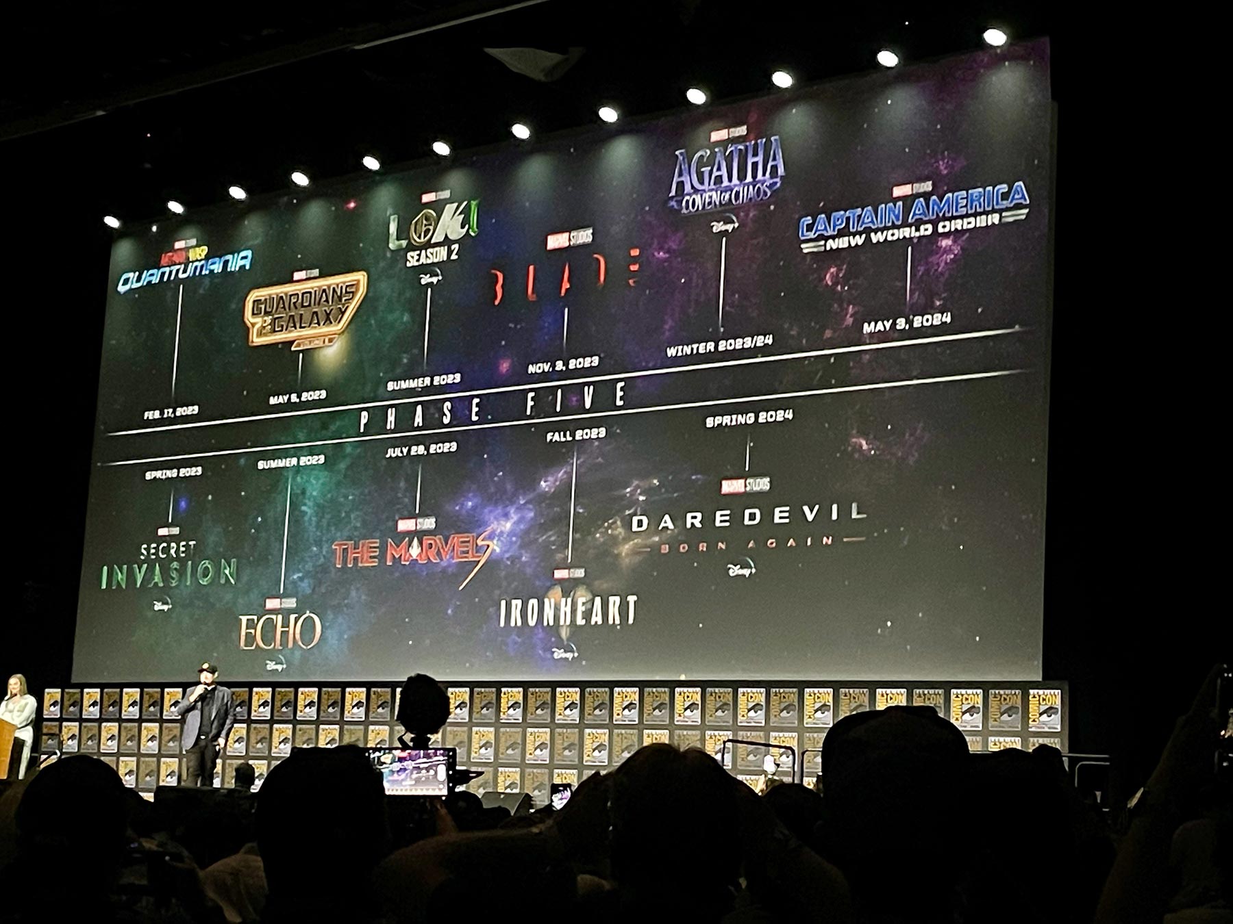 Some pics from the Marvel Studios presentation in Hall H on Saturday, July 23, including the Phase 5 timeline, Paul Rudd for Ant-Man: Quantumania, Cobie Smulders for Secret Invasion, Karen Gillan with Chris Pratt and Pom Klementieff for Guardians of the Galaxy Vol. 3, and the surprising announcements of two Phase 6 Avengers movies, coming in 2025: The Kang Dynasty and Secret Wars, and the over-arcing title for MCU Phases 4, 5, and 6: “The Multiverse Saga.” Marvel also gave out a spiffy baseball cap with that title on it. Click on the photos to see them larger on your screen.