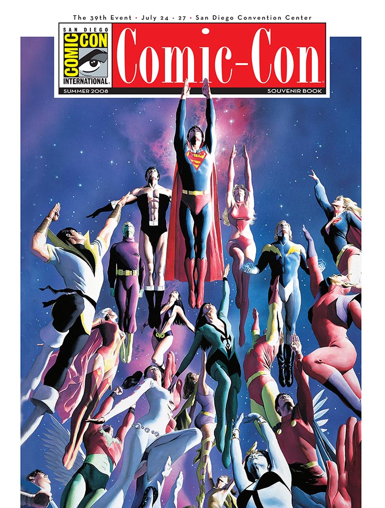 Eventually, I got into a rhythm with the Souvenir Book, and the season for it started—for me, at least—in the fall of the previous year when I started to work on ideas for the cover. A small group of people at Comic-Con, including myself, Jackie Estrada, and the programming department, discussed anniversary themes for the next year, and from there I decided what would work for a cover. In 2010, I started to get the Souvenir Book cover to be used as the con’s official T-shirt, working with Bob Chapman of Graphitti Designs. Most times from that year on the same art was used, but Bob and his designer, Josh Beatman of Brainchild Studios, usually utilized different type treatments and sometimes made adjustments to the art due to the nature of T-shirt design and printing. But the cover art—and permission from the publishers to use it, along with their approval of an artist—was always my starting point, and for the most part, I dealt exclusively with both the artist and the companies involved. From there, Comic-Con would establish the anniversary themes and I would figure out which ones lent themselves to Souvenir Book coverage. Most times this was a very simple process: 2007 was the 30th anniversary of Star Wars, so there was a cover, as was the 75th anniversary of DC Comics in 2010, the 50th of the Marvel Age of Comics in 2012, the 75th of Batman in 2014, and so on. Working with the artists was the best part, although some of them were … let’s just say a little lax in the deadline department (twice I got the art on the absolute last day it had to go to the printer; I had a number of sleepless nights, but I was pretty sure no one would want a coverless book).