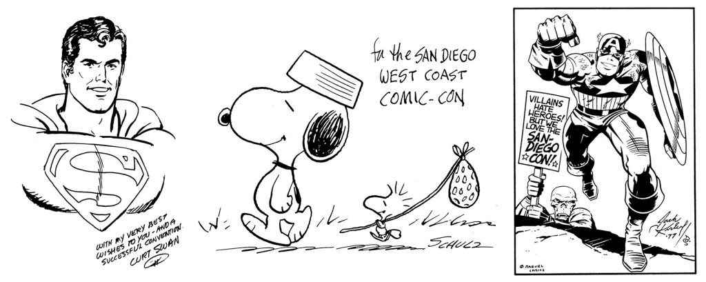 Three interior drawings from 1970s Program Books, including Superman by Curt Swan, Snoopy and Woodstock by Charles Schulz and Captain America by Jack Kirby, inked by Dave Stevens. Art © DC, © United Media, and © MARVEL
