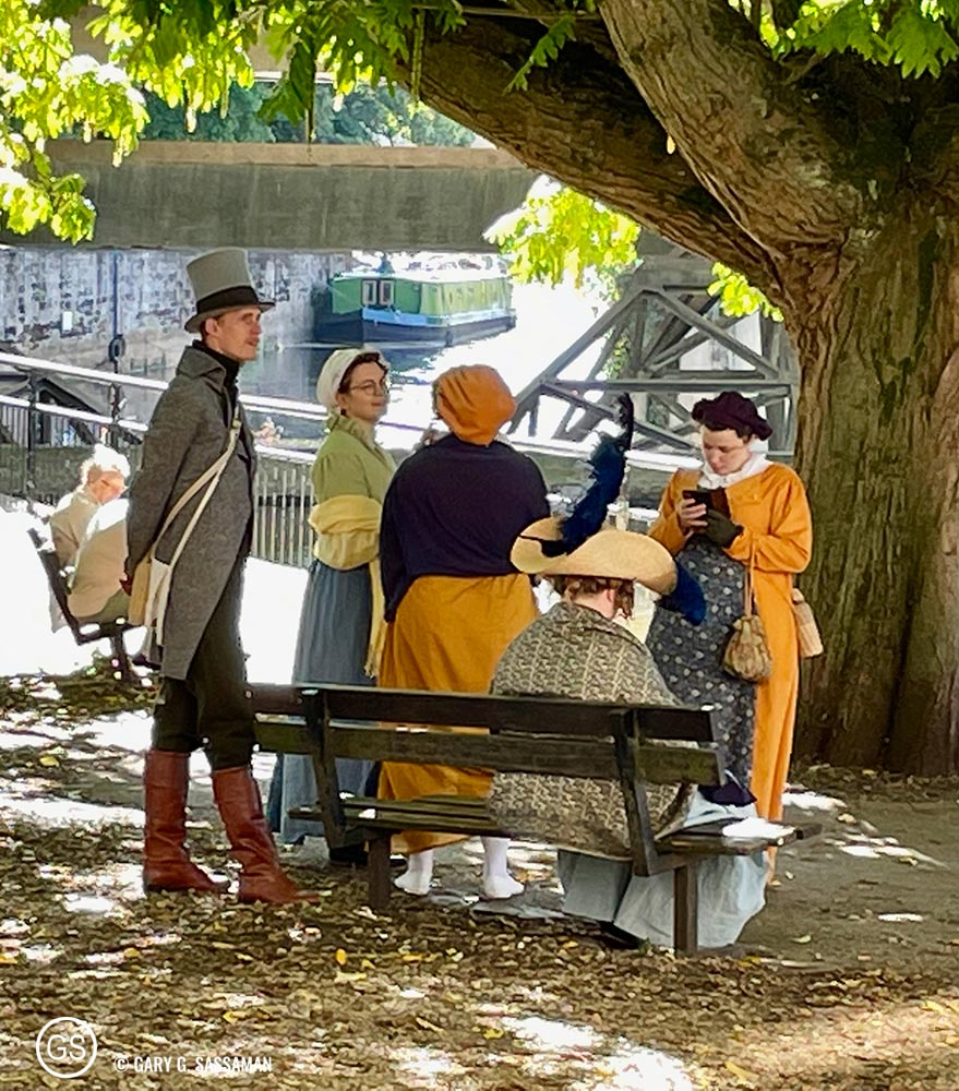 The Parade Gardens (top row and first photo on the bottom row), Jane Austen “cosplayers,” and one of the wonderful windows of Mr. B’s Emporium of Reading Delights.