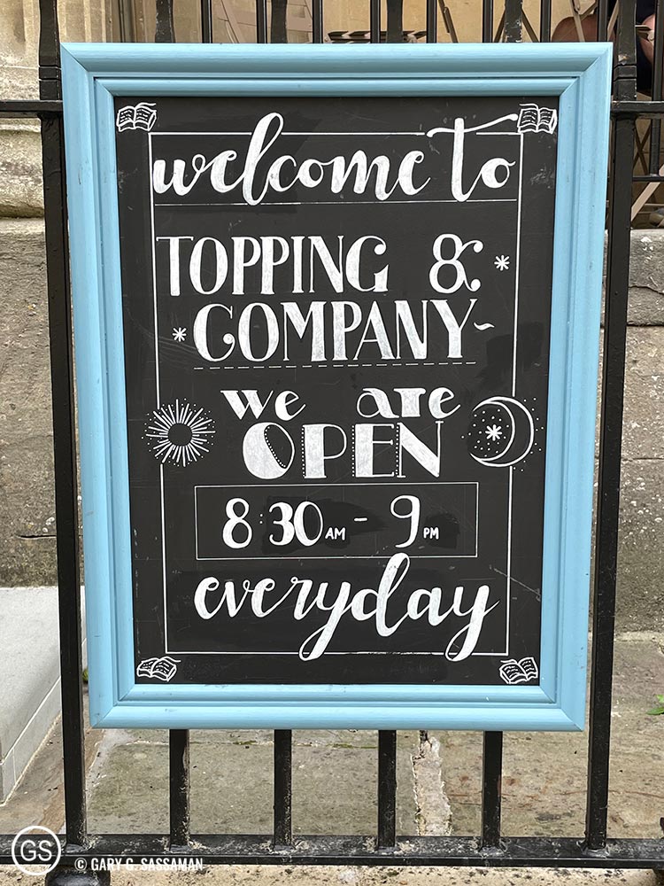But, of course, before I sat down for a two-hour movie respite, I walked around Bath, including the beautiful Parade Gardens, which were very close to my hotel. Because of the Queen’s death, this was open to the public without having to pay an admission fee. I walked along the canal adjacent to it, encountering a number of people dressed up in Jane Austen costumes alongside some quaint houseboats (it made me wonder what it would be like to live on them). I’m not sure if the Austen cosplayers were tourists just dressing the part in the swing of things, or professionals paid by the city or some tourist organization to act as living, breathing atmosphere in this quaint town. I also sought out and found (although it was a bit of a quest through the narrow streets of Bath), Mr. B’s Emporium of Reading Delights, a delightful bookstore that took up multiple floors over two storefronts. After the movie, for dinner, I once again scratched my Pizza Express itch, boldly (or blandly) proving that I am definitely NOT a foodie, even when I travel. I limped back to the hotel and spent a quiet evening with my aching foot propped up on a pillow.