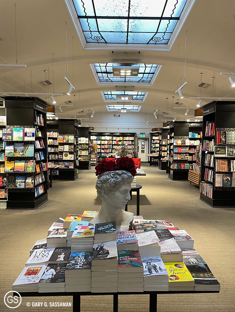 So here was the plan: Get up early-ish, enjoy a leisurely breakfast in Hilton London Bankside’s wonderful OXBO restaurant, and then walk along the south bank of the Thames until we got to Westminster Bridge, walk across that and through St. James Park and Green Park and onward to Foyles Bookstore on Charing Cross Road. And it almost worked … in fact, everything except the parks part. What I hadn’t figured on was both parks were all bolloxed up (stay in London for three weeks and you pick up a few new words) with thousands upon thousands of people wanting to go to Buckingham Palace to pay their respects to the Queen and place flowers. The normal paths I was familiar with were re-routed, and security forces directed us away from them. It was fine, though … packed with people, but fine. We eventually—after a nice walk along the Thames and a stop to visit the outdoor book stalls near BFI—made it to Trafalgar Square and up onto Charing Cross Road and Foyles.