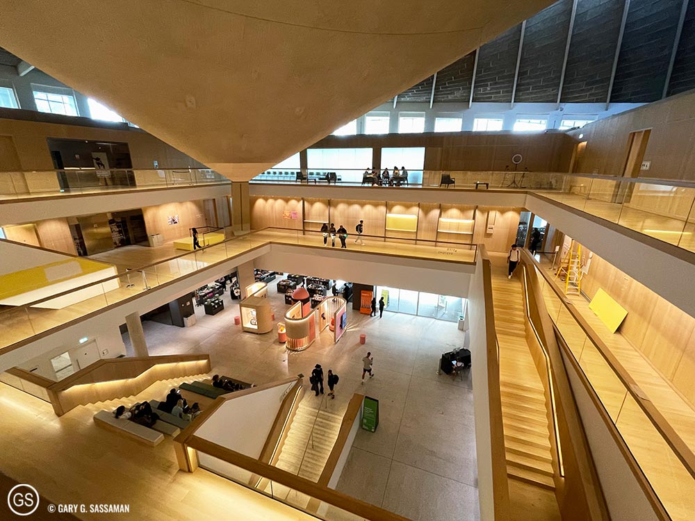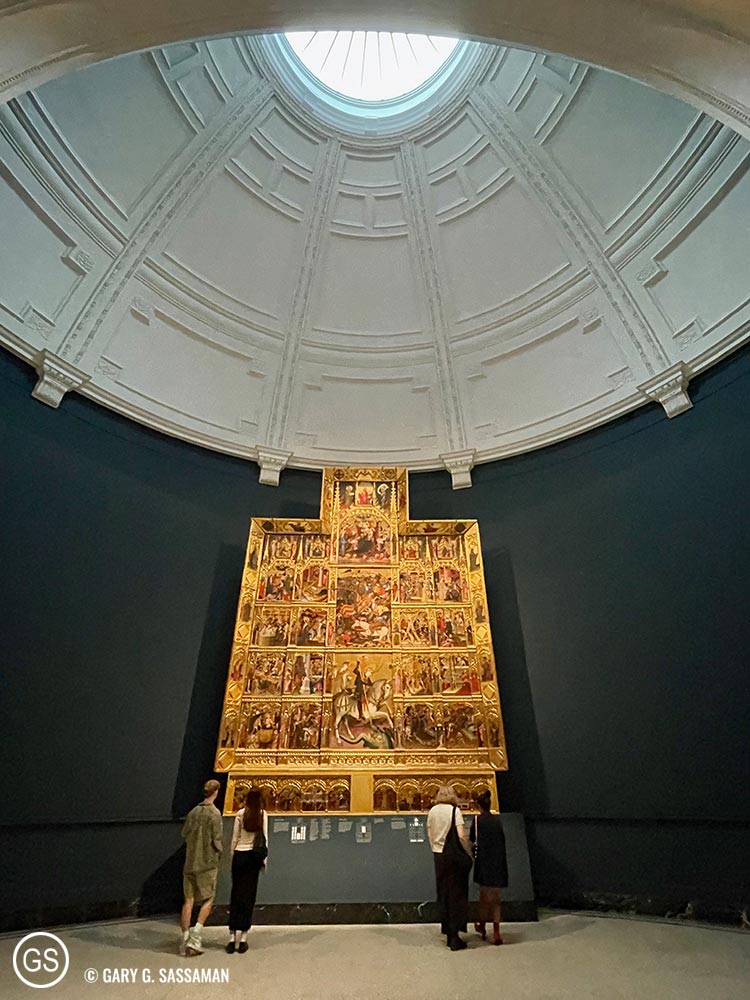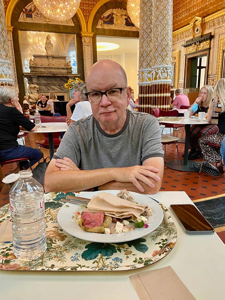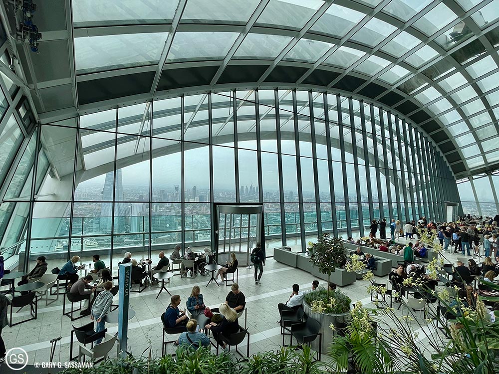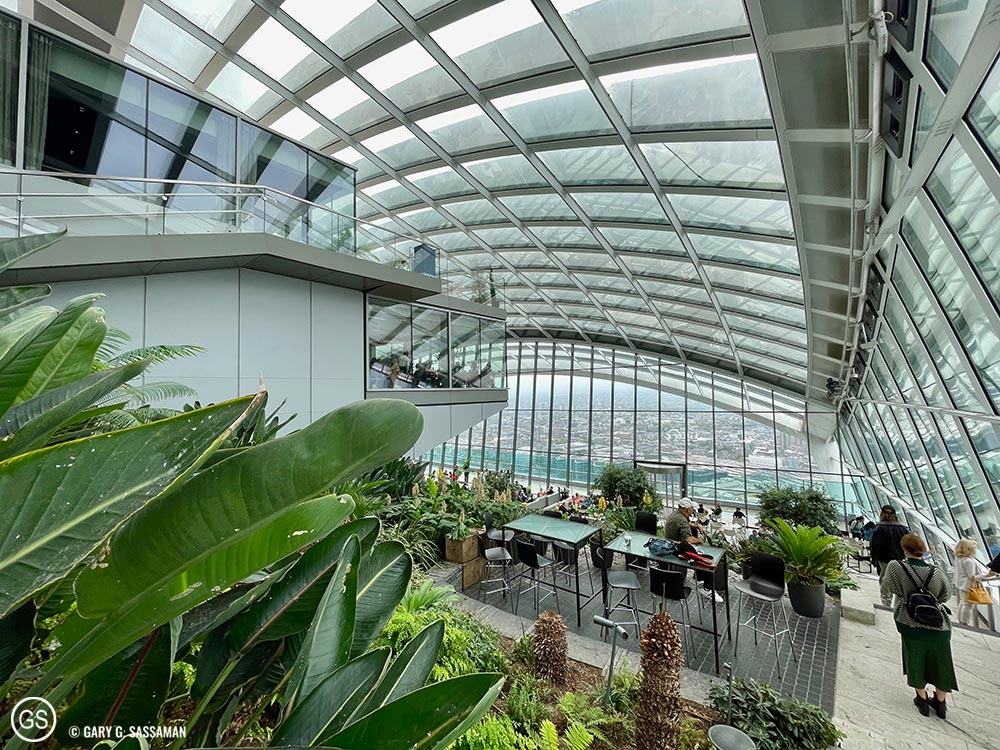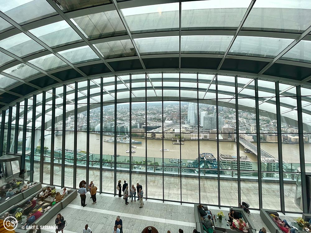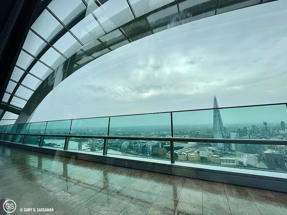 For Tuesday, I had planned a visit to Sky Garden, the free viewing deck in what is locally known as “the Walkie-Talkie Building,” on the north side of the Thames. I had visited there before and much preferred it to the pricey trip up to the top of The Shard, which I experienced in 2019. Sky Garden is free, but you have to book it in advance. It also has two restaurants, and I made a lunch reservation for us at one of them, Darwin Brasserie. With the reservation, we were able to get into Sky Garden 45 minutes in advance of our lunch time and we roamed around and took lots of photos. It was a rainy and overcast day, so the outdoor area wasn’t open, but the beauty of Sky Garden itself, coupled with the view we had, was more than enough to justify the visit. Lunch was great, with a table front and center for one of the best views in London, even with the rain. I had a smoked salmon and haddock fishcake (the Brits are big on fishcakes and fish fingers) along with fries, and Laurel had the Spiced Chickpea and Walnut Burger with fries. Both of us loved the food and the service was excellent, something that’s hard to come by in London these days, due to the same problems we’re having in the US: not enough workers.