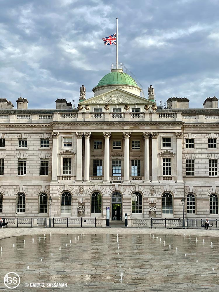 Next up and sort of just down the street was Harrods, the world famous mega-department store, which is always worth at least a walk-through of the Food Hall. (I myself prefer Selfridges, which is smaller and less crowded, but I know that’s tantamount to heresy and shows what a déclassé person I am.) Nothing was bought by either of us at Harrods, although they already have their Christmas store open (maybe it’s open year-round, I dunno—but it’s too early to even look at Christmas stuff). From there we took the Tube to Covent Garden, where I wanted Laurel to see the London Graphic Centre, a wonderful art supply store, nestled in some back alleys near CG. Laurel very optimistically grabbed a basket on her way into the store but, even though she did purchase some items, failed to fill it. We also visited Stanford’s Travel Store, a lovely bookstore which also features maps and travel items. We decided to take the scenic route home, walking all the way up the Strand (stopping to look at historic Somerset House, photo below), Fleet Street, past St. Paul’s Cathedral, and back over the Millennium Bridge to our hotel, where we ate dinner in the Executive Lounge.